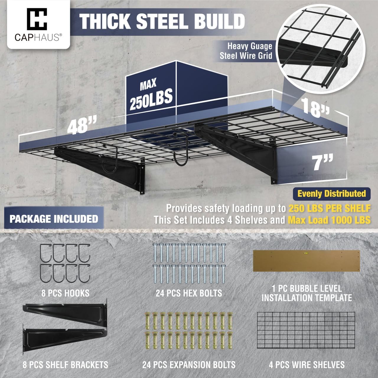 - π¨ Robust Steel Construction - Our garage wall shelving set includes wire shelving and wall brackets with a durable powder-coated finish, marrying a sleek look with sturdiness. The intelligent design of our steel storage rack allows overhead storage and accessory hook usage, maximizing garage space and organization. We provide high-quality screws that have undergone rigorous testing to ensure durability. Each hook included in the package has a weight capacity of 33 lbs.