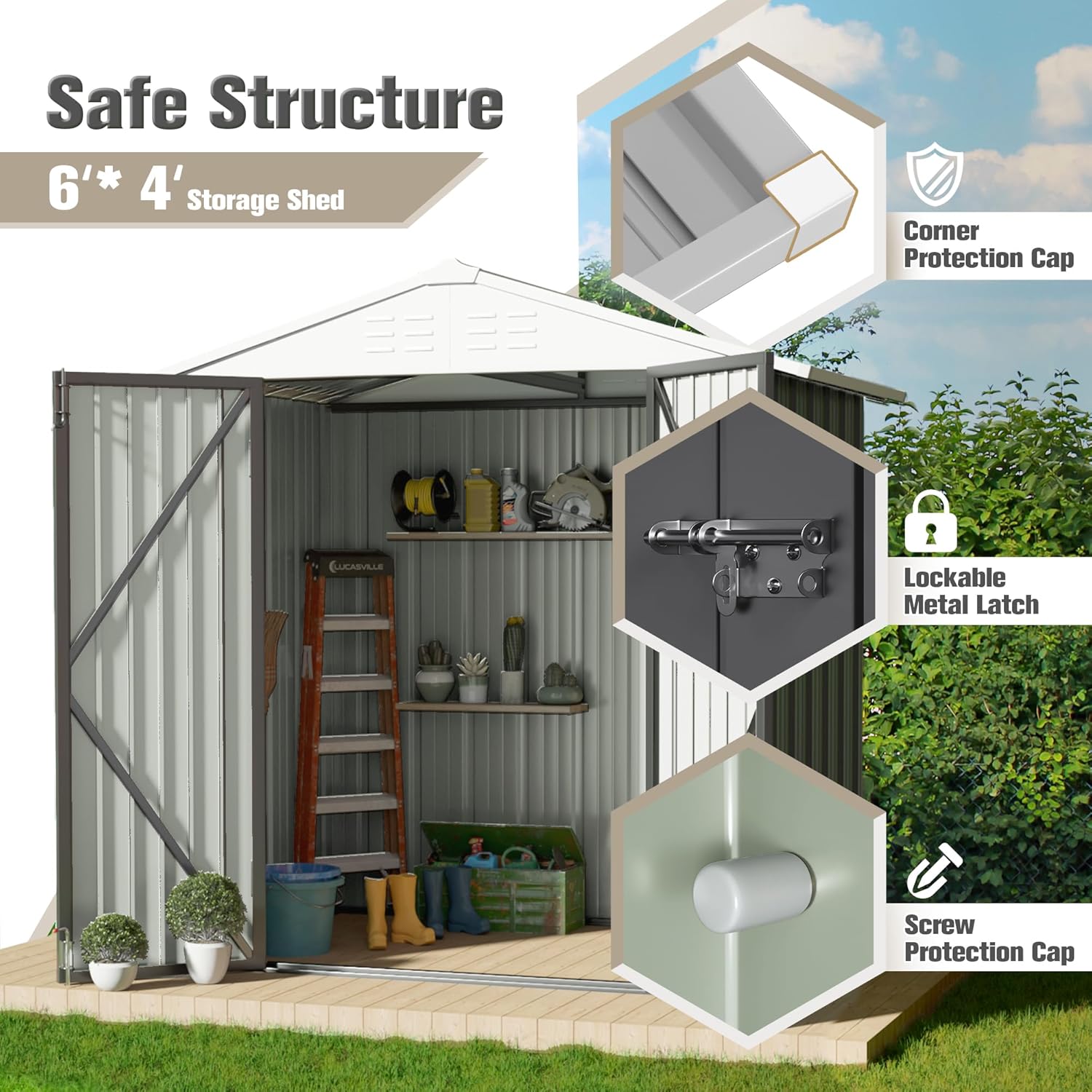 - User-friendly design: This lockable storage room is designed with plastic protective caps with pointed corners and sharp screws to prevent people from being injured during installation or use.