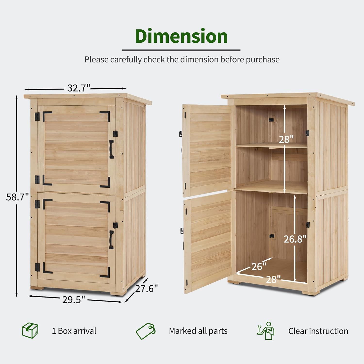 - Fir Solid Wood: The vertical storage shed is made of high-quality pure fir wood, and the exterior has been polished to express a rustic style. Natural Color blends easily with other dΓ©cor and natural settings.