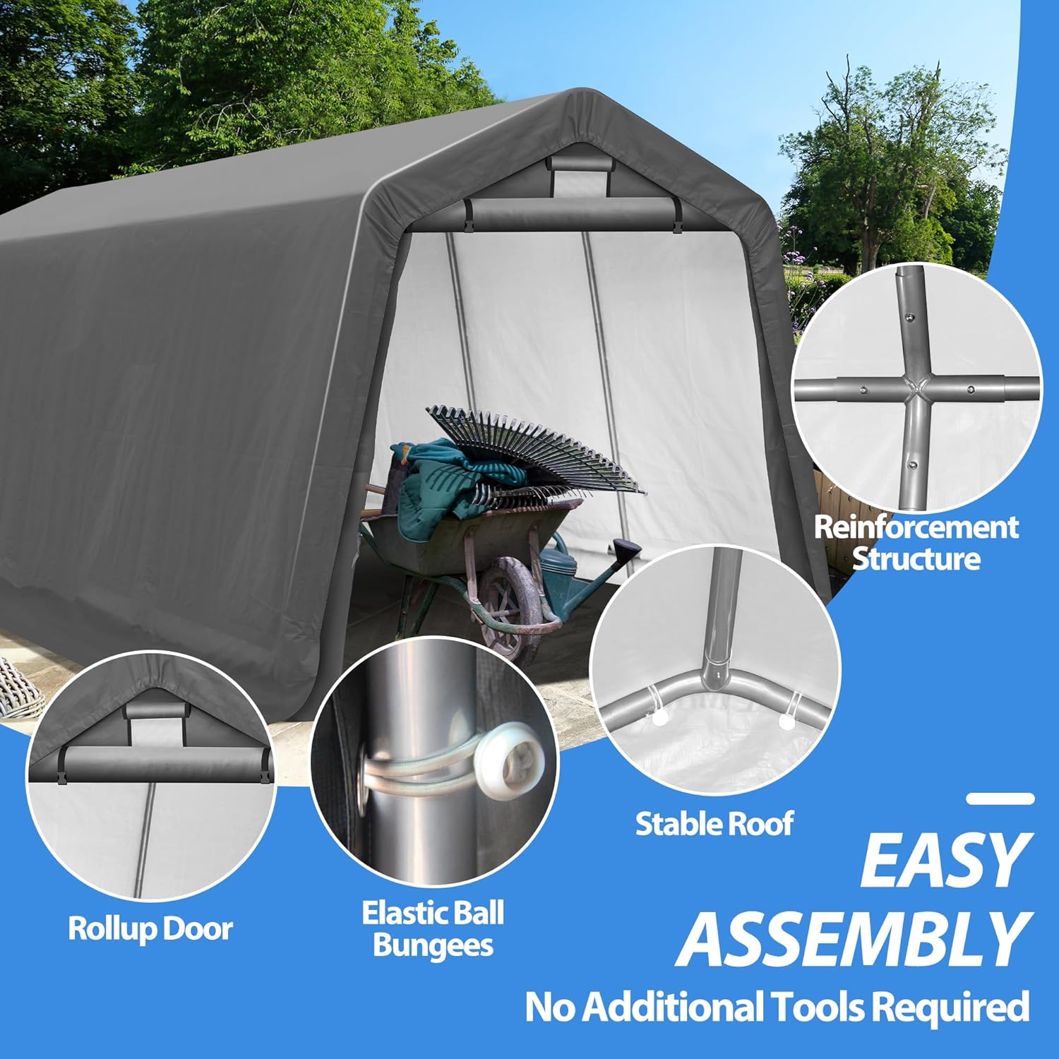 - WATERPROOF TARP: The portable storage shed is designed with 170g premium polyethylene fabric, which is durable and can withstand harsh weather conditions, keeping your items dry and protected from the rain and UV rays.