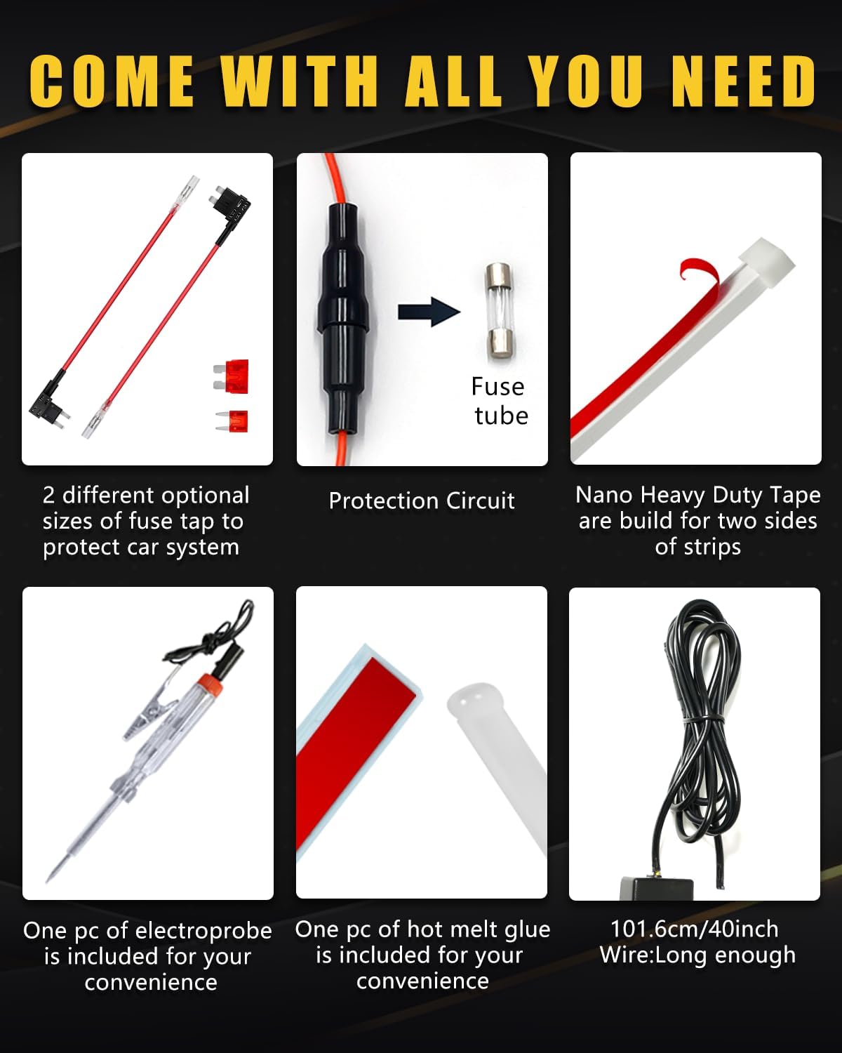 - Special Feature : Package includes one test pencil,one hot melt glue stick., Soft & Bright Light ,No Dark Spots, Two sides of Strip are Build with heavy duty Nano Tape, With 40 inches wire, With Fuse Tap Adapters for protection circuit Package includes one test pencil,one hot melt glue stick., Soft & Bright Light ,No Dark Spots, Two sides of Strip are Build with heavy duty Nano Tape, With 40 inches wire, With Fuse⊠See more
