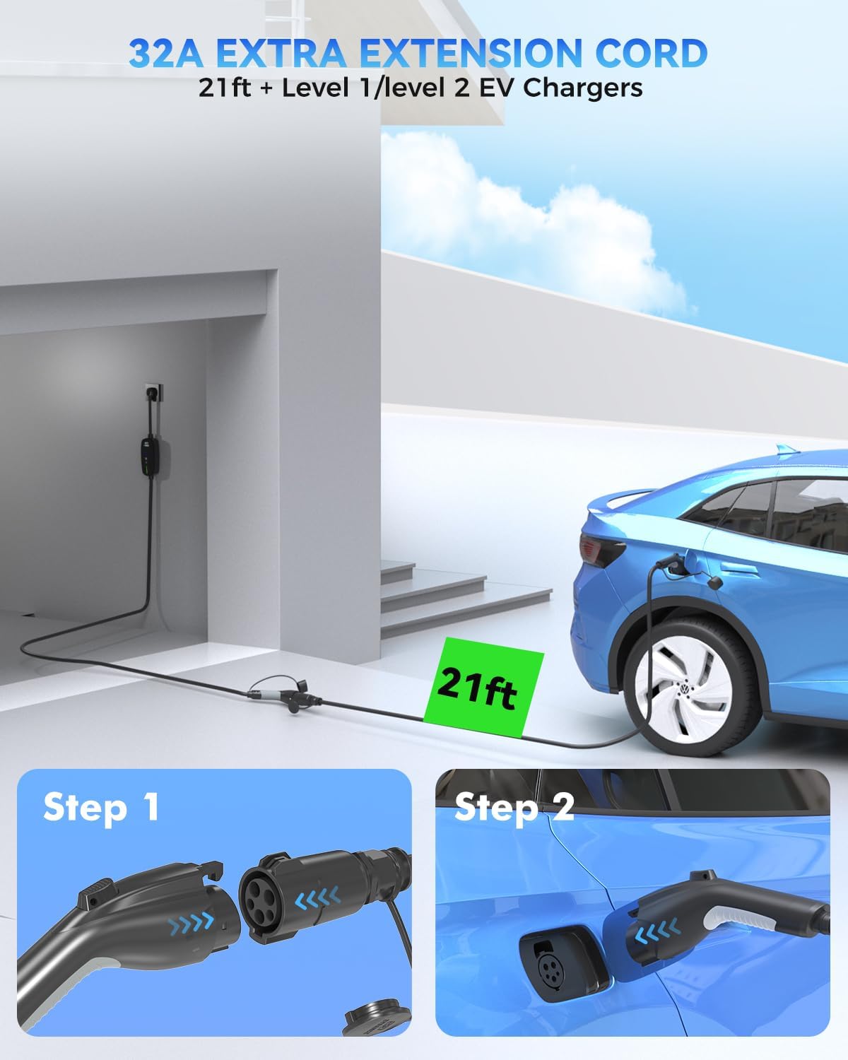 EV Charger Extension Cable, 21ft 32Amp J1772 Extension Cable Compatible with 110V-240V SAE J1772 EV Chargers, Suitable for J1772 EVs/PHEVs, Level 1/ Level 2 IP66 Car Charger Extension Cord with Bag