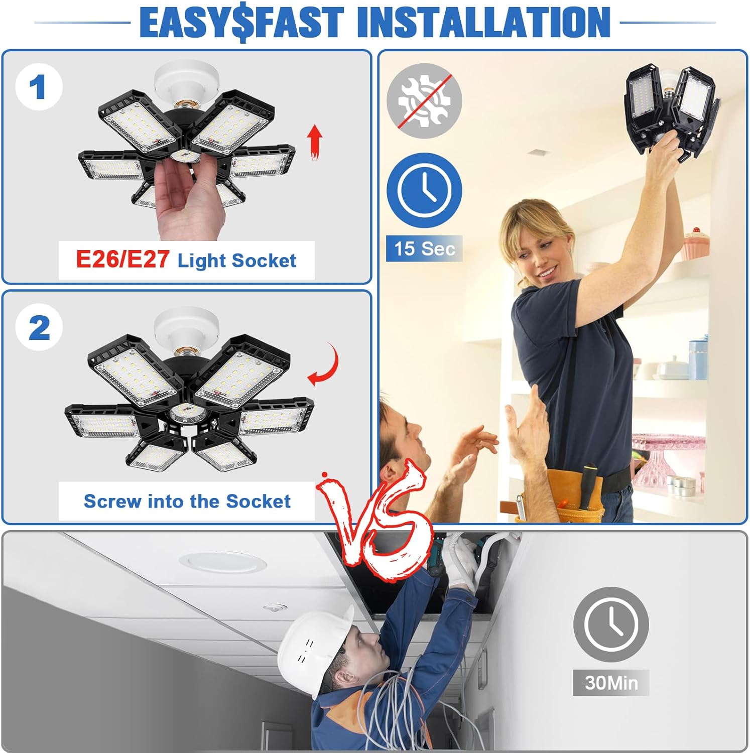 - 【Safety & Energy Saving】Upgraded Garage Lighting Bulb is made of high quality aluminum heatsink and each panel features a unique hollow-out design that make a better heat dissipation. Make lifespan more than 50000 hours , and equivalent to 6 traditional light bulbs, more than 85% energy saving than traditional lamp.