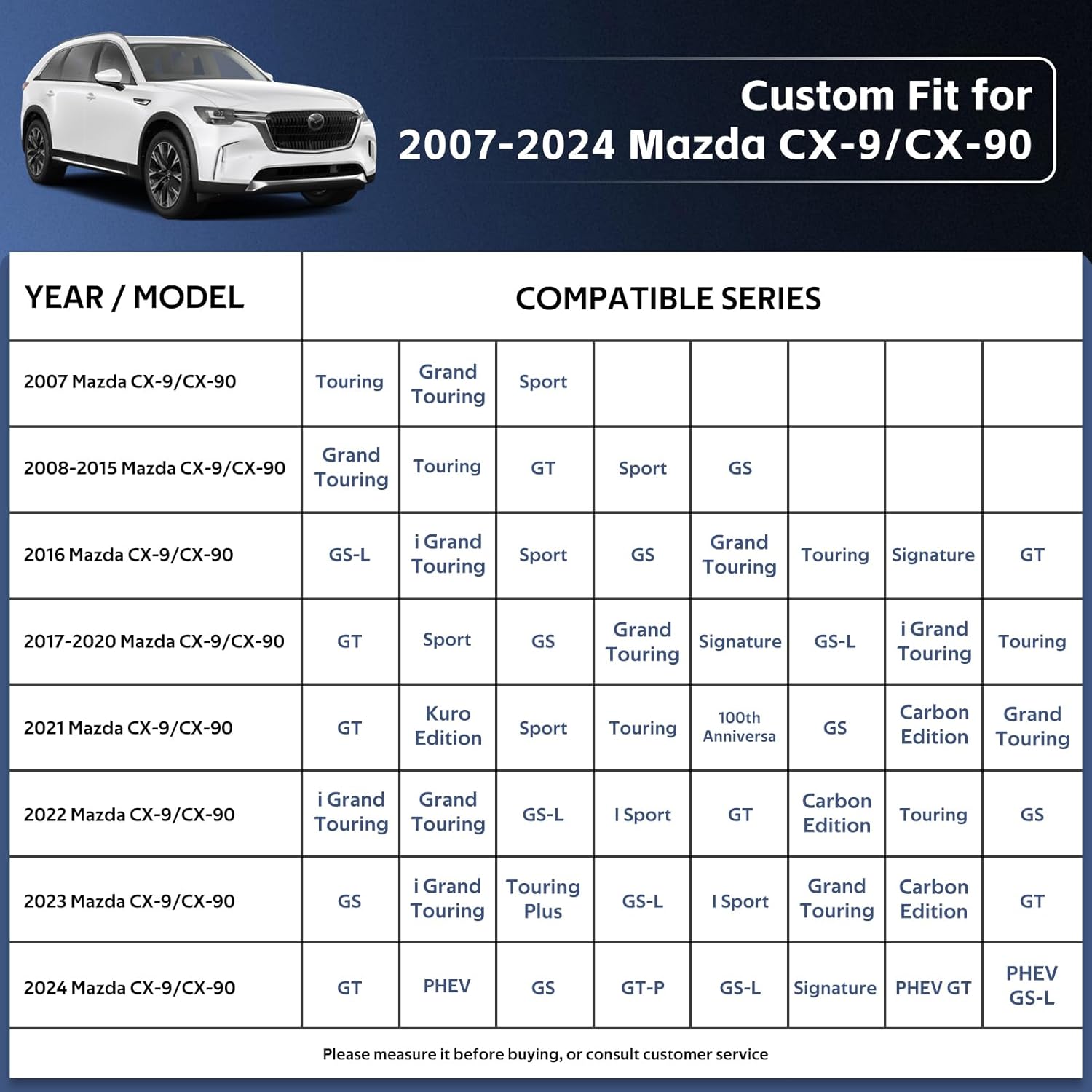 - ăPerfect Fităâ Holthly has conducted experiments to obtain a customized car cover specifically designed for Mazda CX9/CX90 (2007-2024). The custom-like fit of the full cover not only enhances the -aesthetics of your vehicle but also provides superior wind resistance, thereby prolonging the lifespan of the hood. It offers enhanced and long-lasting protection for your car.