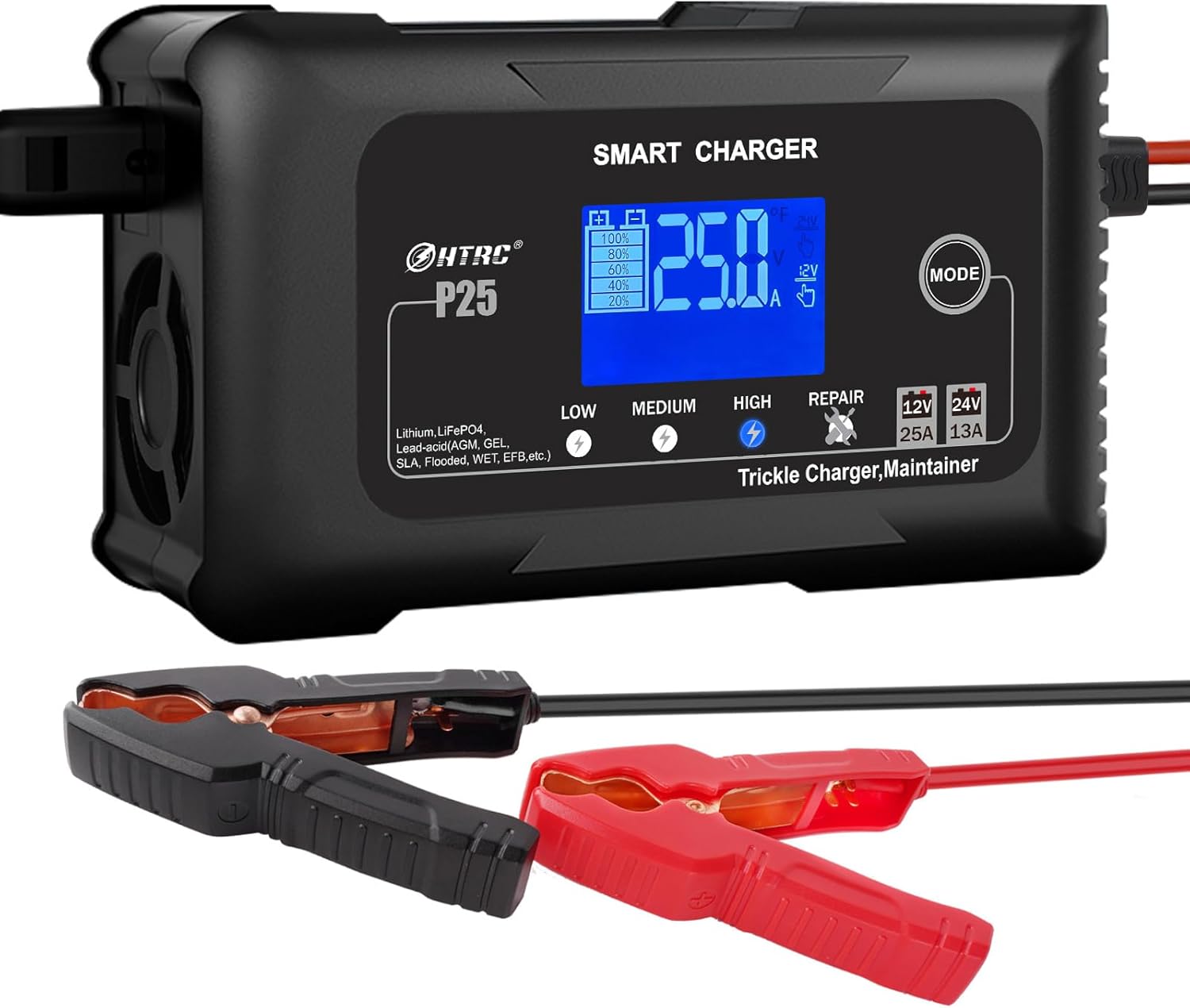 25Amp Lithium Battery Charger, 12V and 24V Lead-Acid (AGM/Gel/SLA) Battery Charger, Battery Maintainer Pulse Repair Charger Trickle Charger Battery Desulfator for Boat, Motorcycle, Golf cart