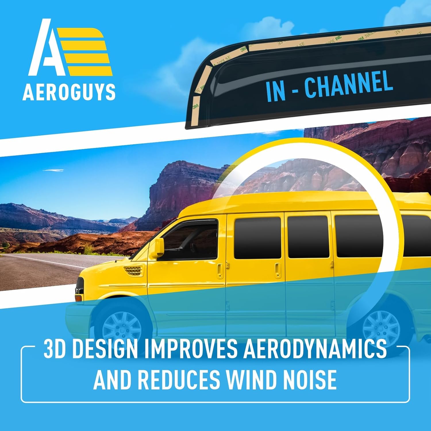 - No Tools Needed, Quick and Easy Assembly β These rain guards are very easy to fit. IN-CHANNEL INSTALLATION provides perfect fit for your van. Just slip it onto your carβs window and your job is done within minutes. There is no drilling or no tools required. Be sure that AEROGUYS window deflectors are water resistant, sun protective and will not bend, break or crack regardless of the weather conditions.