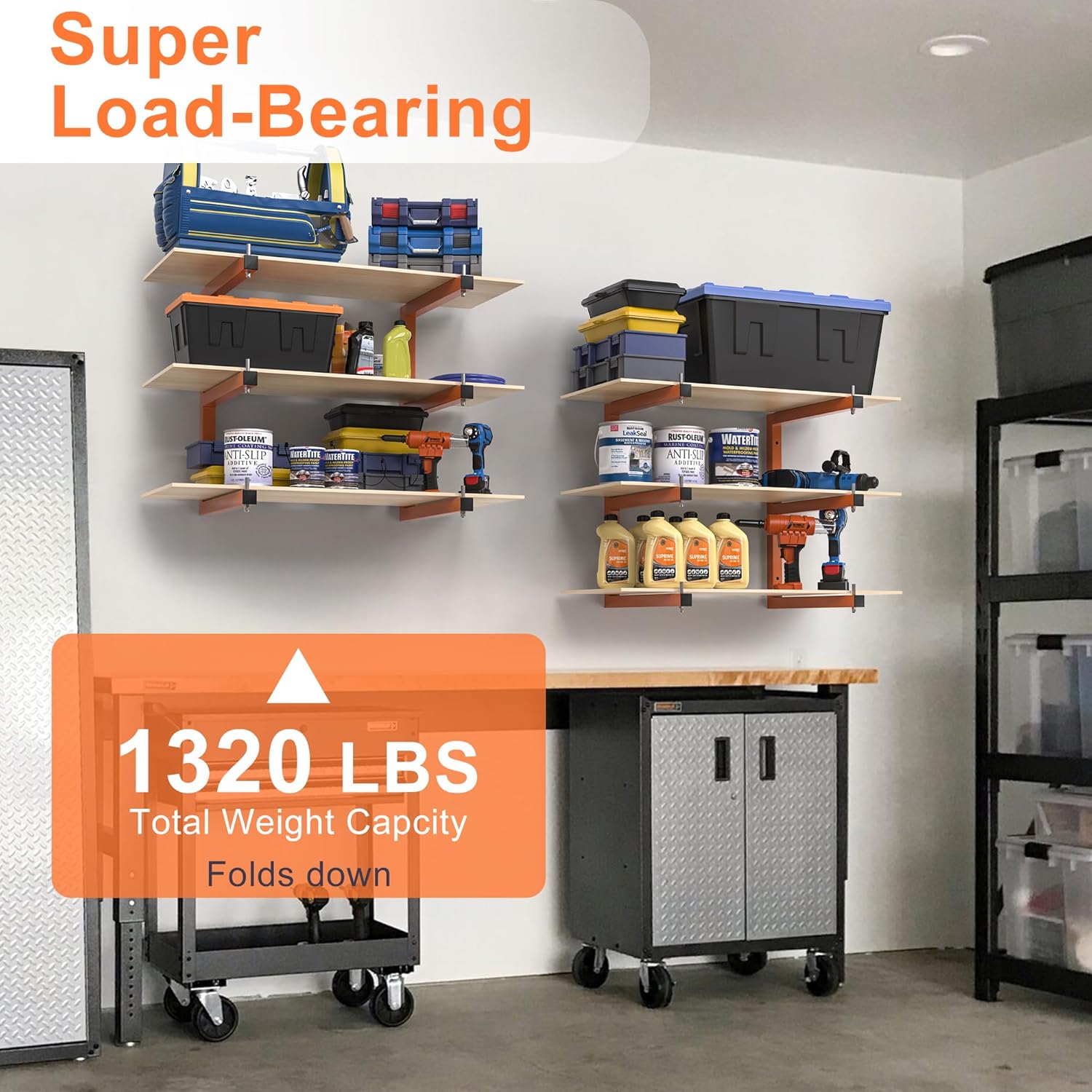 - 1320 LBS WEIGHT CAPACITY : Wall-mounted wooden storage rack adopts a more supportive triangular one-piece design. each shelf can hold up to 220 lbs, the 2-pack wood rack organizer can hold up to 660 lbs, and the 4-pack wood storage system can hold up to 1320 lbs, so you can store all your heavy and bulky items, these metal organizer units are roomy enough for your everyday needs.