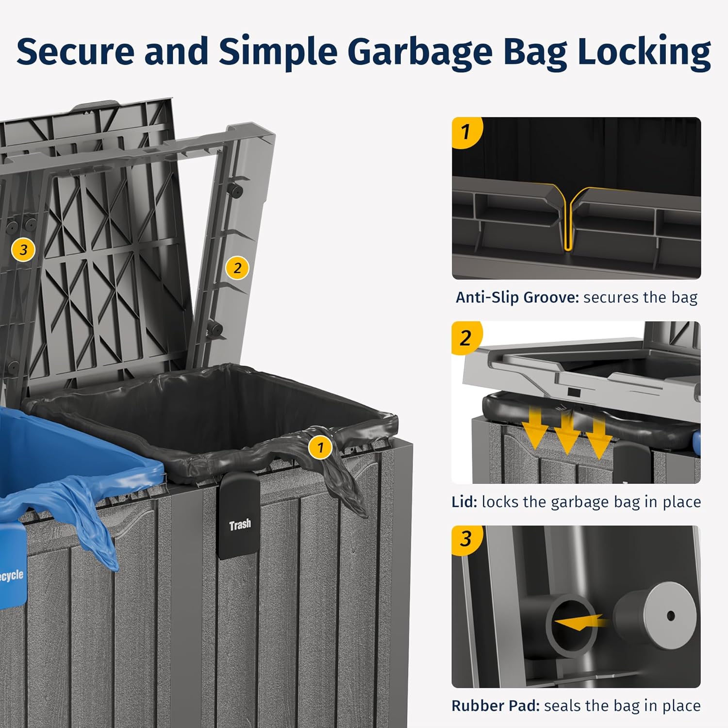 - ๐๐ป๐ฐ๐น๐๐ฑ๐ฒ๐ ๐ฅ๐ฒ๐บ๐ผ๐๐ฎ๐ฏ๐น๐ฒ ๐ช๐ฎ๐๐๐ฒ ๐ฆ๐ผ๐ฟ๐๐ถ๐ป๐ด ๐ฃ๐ฎ๐ป๐ฒ๐น๐: Comes with durable, removable sorting panels, allowing you to easily separate and manage recyclables and waste for a cleaner, more organized outdoor space