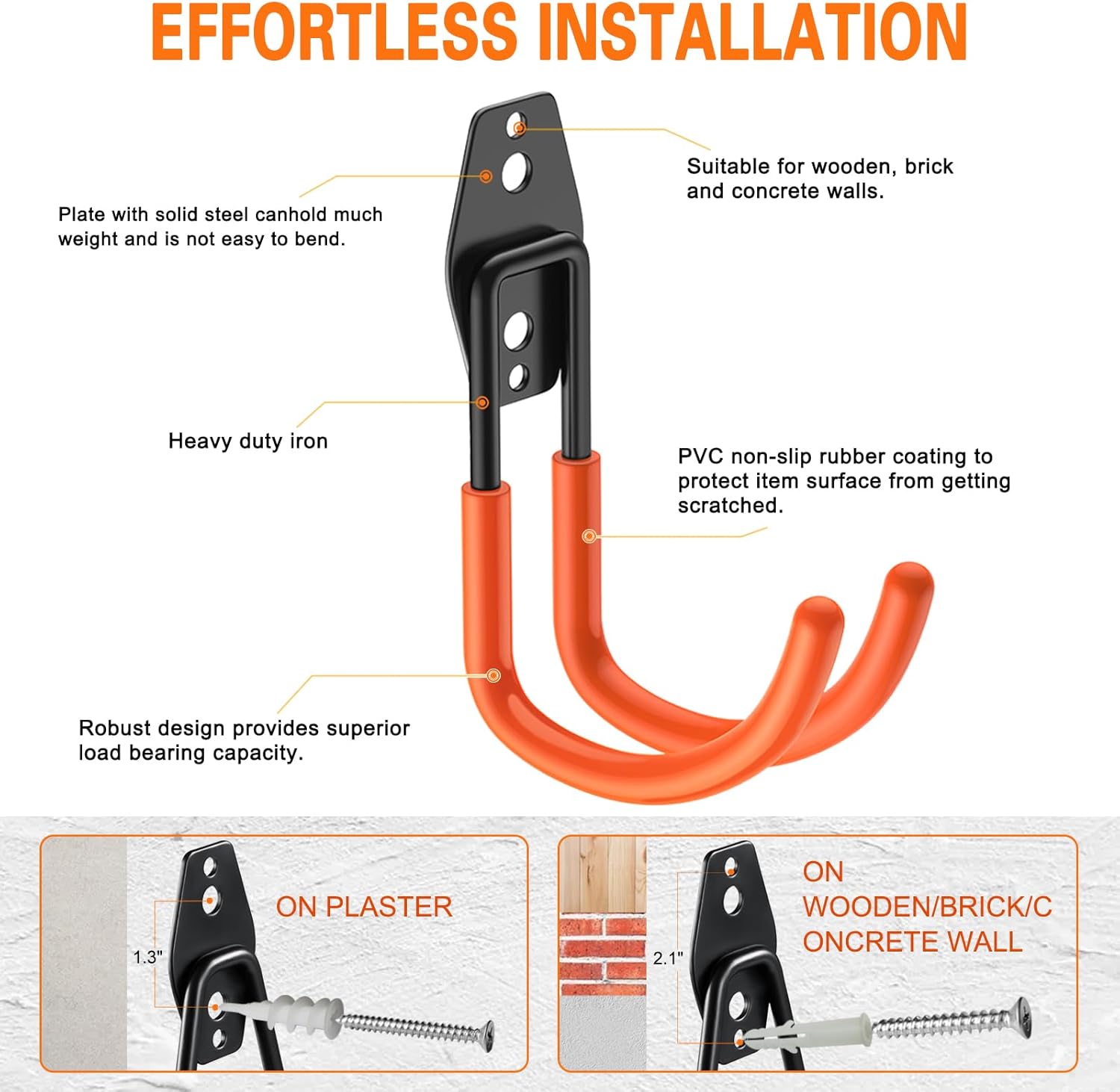 - Heavy-Duty Hooks: Four 3.9 inch J shaped wall mounted garage hooks, The tubular double bar hooks design makes the garage utility storage hooks more stable than regular single tong hooks.