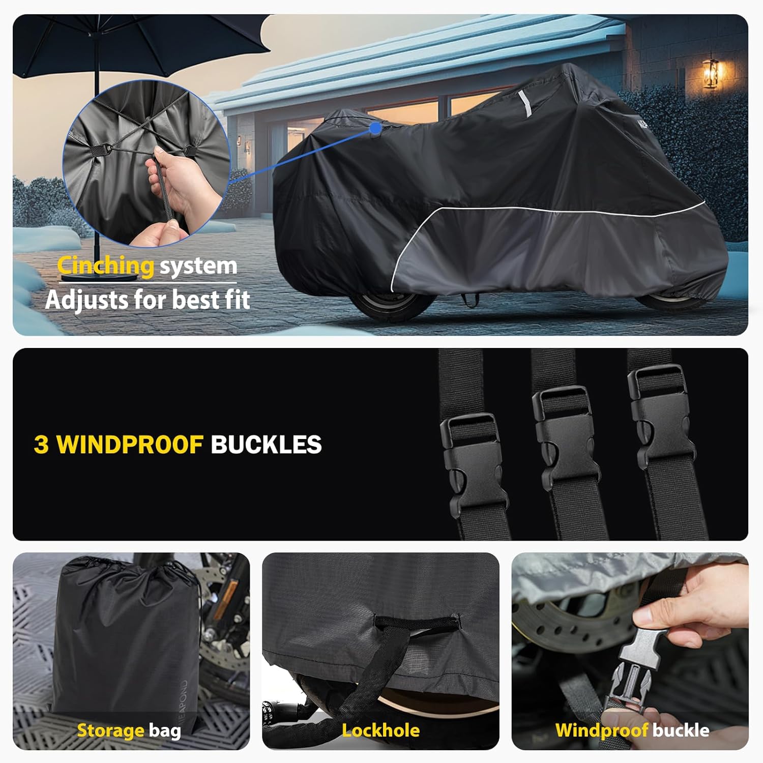 - FIT & SAFETY: The motorcycle cover comes with a full loop of elastic hem at the bottom and an adjustable tightening system at the end that pulls the cover tighter for a better fit. The motorcycle cover is also equipped with reflective strips for added aesthetics as well as greater visibility and safety at night.