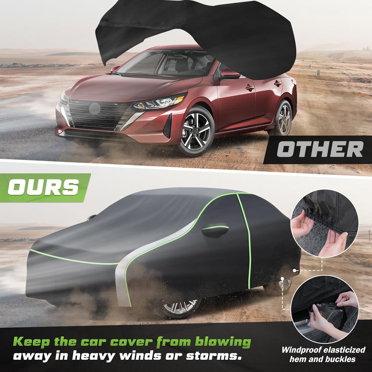 - Reflective Strips, Driver Door Zipper, Fixed Buckles: The reflective strips in the car cover enhance nighttime visibility and parking safety. Driver-side door zipper for easy and time-saving access to the interior. Windproof elasticized hem and 4 buckles secured to the wheels keep the car cover from blowing away on windy days.