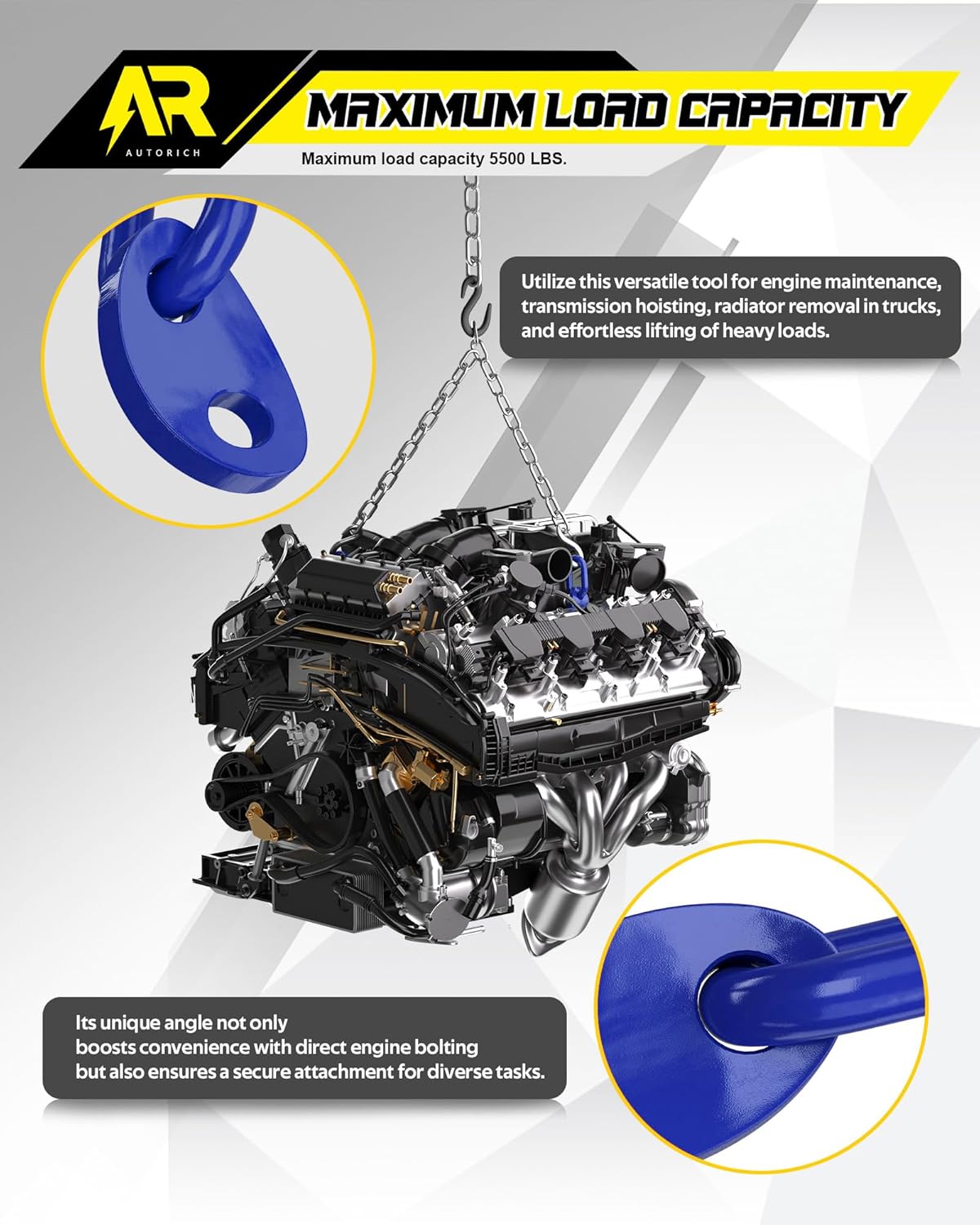 - [Innovative Engineering] Our engine lifting brackets feature a distinctive angled design, enabling direct bolting to engines, transmissions, radiators, and other substantial components. These brackets seamlessly integrate with load levelers and lifting slings, simplifying even the most demanding lifting tasks with precision and ease