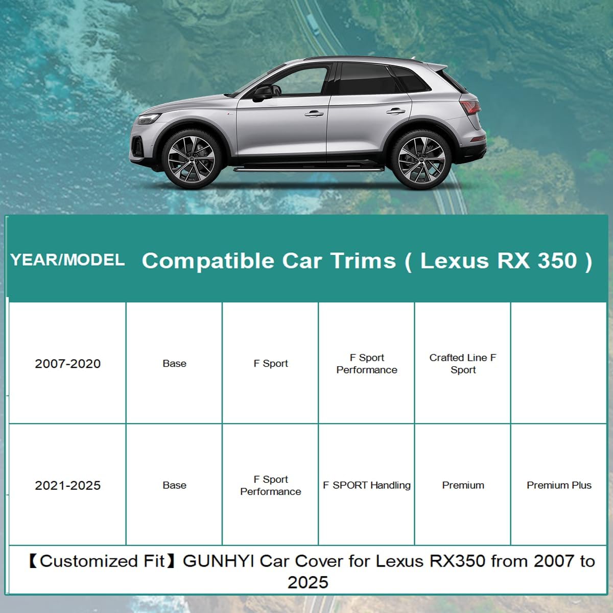 - 【Compatible with】This Full Car Cover Custom fit for Lexus RX350 from 2015 to 2025. Comes with a microfiber towel that you can use to clean your car, because if there is sand on the surface of the car before use, it may damage the paint.