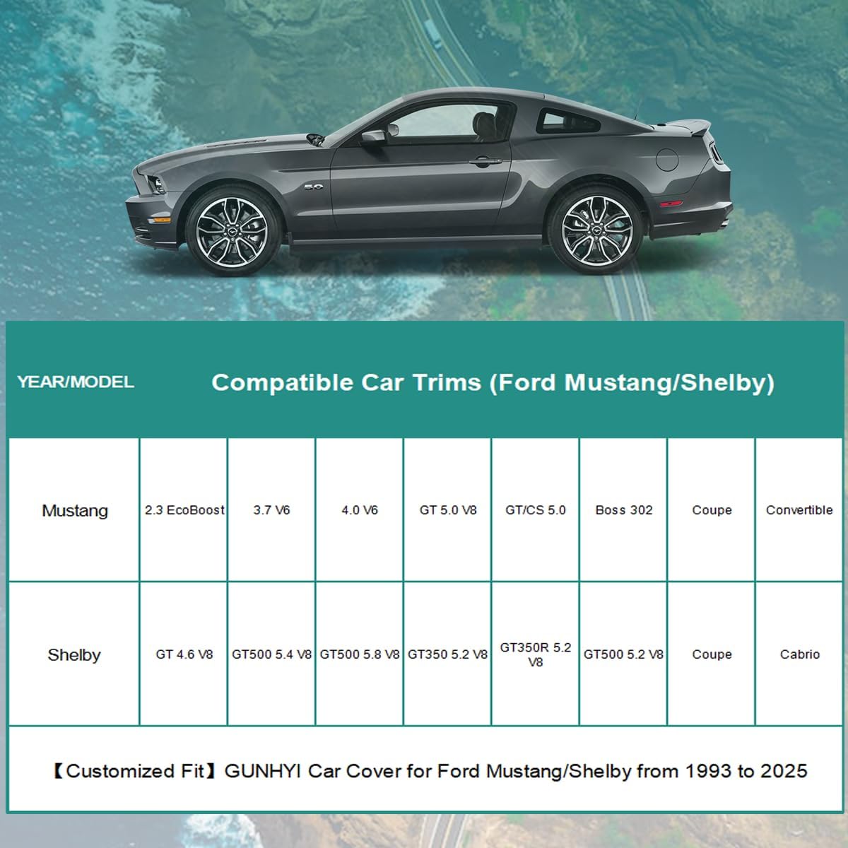 - Material Vinyl : Vehicle Service Type Custom fit--Ford Mustang/Shelby from 1964 to 2025