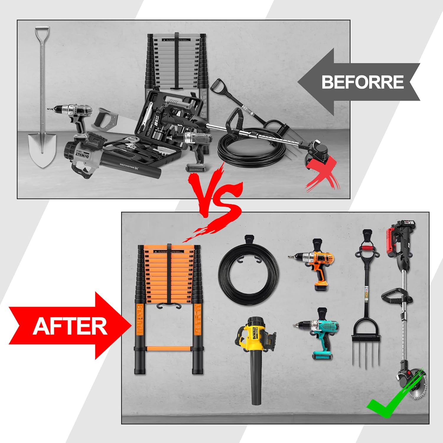 - 【MULTIPURPOSE GARAGE TOOL HANGER】Mount it in your garden, yard, shed or garage as you wish. Perfect for hanging power tools especially like string trimmers, weedeaters, power drills, gas edgers, chainsaws, blowers and lawnmowers, or garden tools like shovels, ladders, mops, brooms, hoses, snow shove or any hangable items.