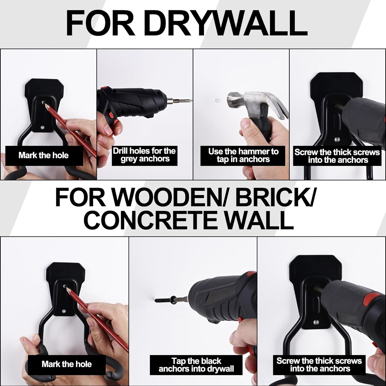 - 【EASY TO INSTALL & USE】The line trimmer hanger Hook can be quickly and neatly installed and removed on drywall, concrete, brick wall, wooden wall, and more. Follow the installation manual, you can easily install the weed trimmer wall hanger. This Juformin weed eater rack comes with two pre-drilled holes and fixing screws & anchors for easy installation, fits most wall surfaces with good flexibility