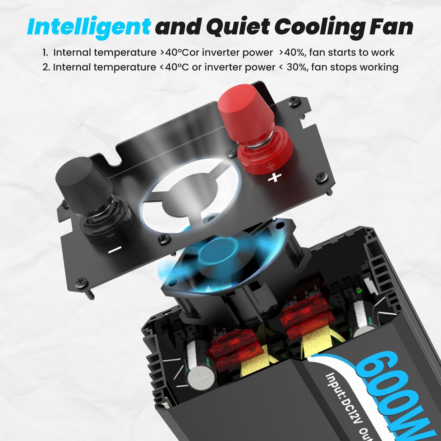 - 【POWERFUL 12V DC-110/120V AC CAR POWER INVERTER】- With professional and advanced technology 600 watts pure sine wave power inverter, you'll be able to charge and power your smartphones, laptops, entertainment devices, small-sized appliances, and other mobile devices.