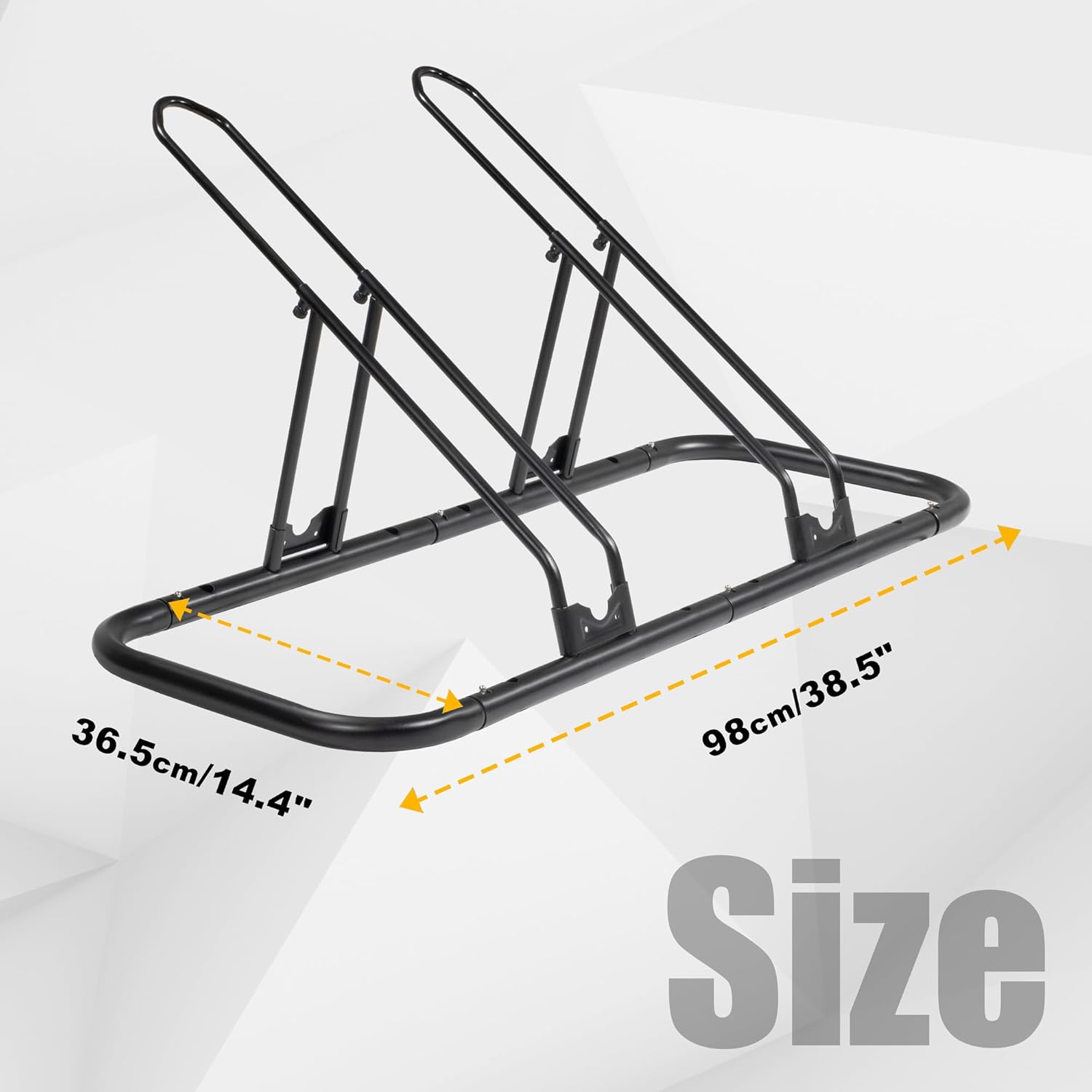 - DURABLE & RELIABLE - Built with quality steel and a durable powder-coated black finish, this parking rack ensures a secure hold on your bikes with its robust design, providing a solid and reliable solution for bike storage. The front and back plate holding system prevents the upholder from becoming wider, as a broad holder could impact the stability of bike holding. The dimensions of a 2-bike rack are length 98cm/38.5" and width 36.5cm/14.4". Unique Patented Design, PAT 18/513,639.