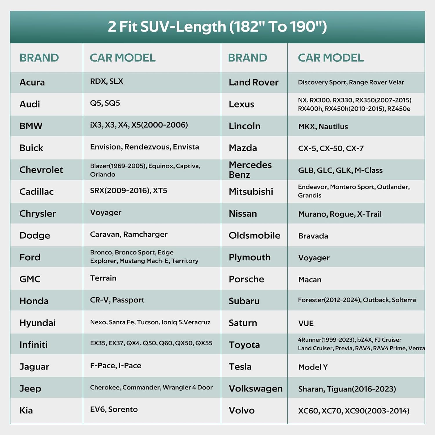 - ăCHOOSE THE RIGHT MODELă: Molebt SUV car cover fits SUV/Jeep Length: 182"-190". For example Hyundai Santa Fe, Toyota RAV4, Nissan Rogue, Volkswagen Tiguan, Kia Sorento, Nissan Murano, Jeep Cherokee, Subaru Outback, Audi Q5, Lexus RX350, Mazda CX-5 etc.