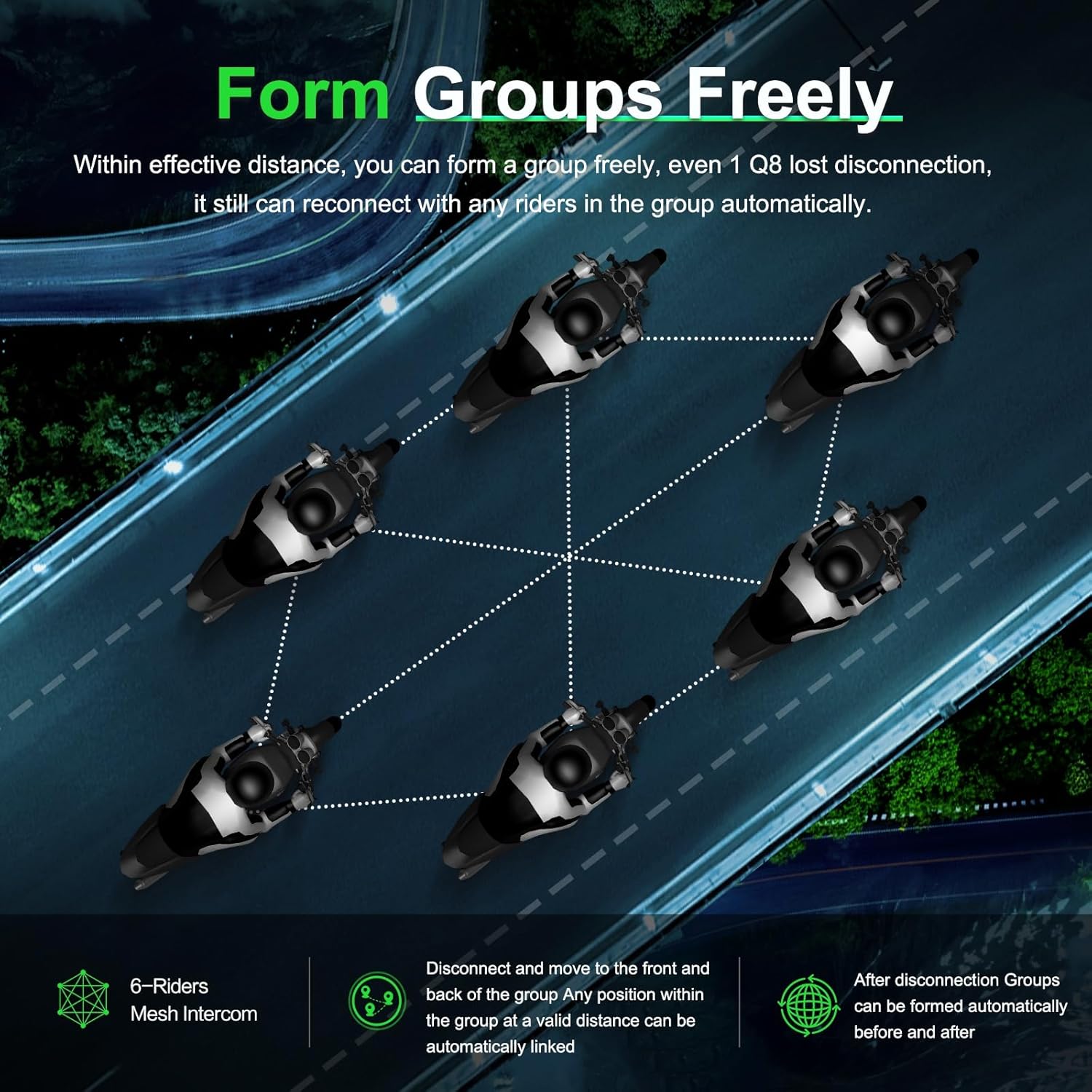 - 【Powerful Mesh Communication Technology】The Q8 supports 6 riders talking simultaneously, with an intercom distance of up to 1,000 meters. It adopts advanced Mesh3.0 technology, allowing you to freely form intercom groups within the effective range and automatically reconnect with neighboring users in the group after disconnection. Compared to other Bluetooth walkie-talkies, it has stronger signal penetration capabilities in environments with obstacles such as tunnels, slopes, and narrow curves. Moreover, the Q8 supports connections with other brands of Bluetooth walkie-talkies available on the market.