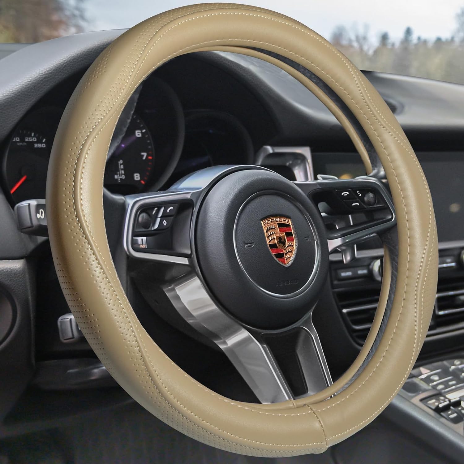 - SOFT & COMFORTABLE TOUCH: Using a real leather streeing wheel cover to help absorb hand pressure from the steering wheel. Itβs soft and durable with a breathable touch.