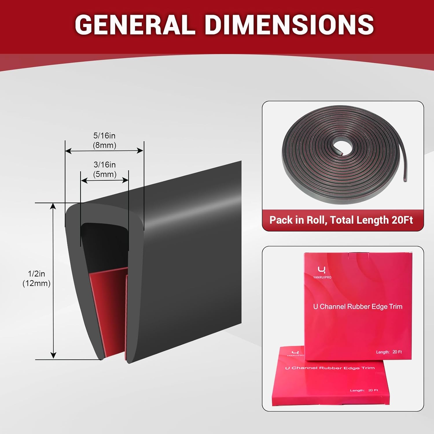 Rubber Edge Trim, 3/16" Self Adhesive Flexible U Channel Edge Protecter for Glass, Flexiglass and Plywood, Fit for 5/32"-7/32" Width Edge, Black Color, 20Ft, EPDM Material