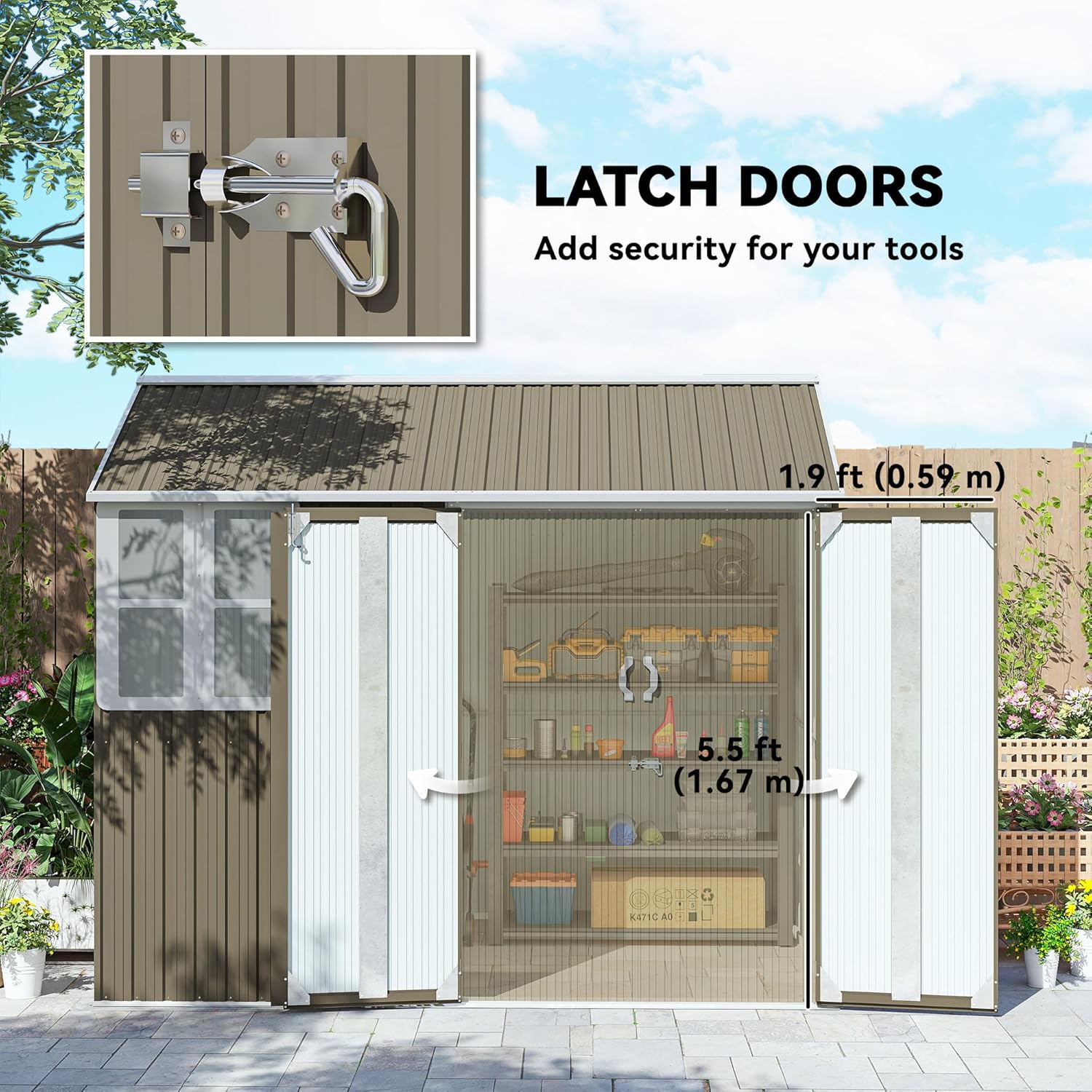 - Doors & Windows: Keep important tools locked away; a lockable latch on double doors makes our metal garden shed an extra secure option for outdoor storage. Enjoy a shed that's an accent. Not only does our tool storage shed include vent windows, but natural light via a cottage-style window as well.