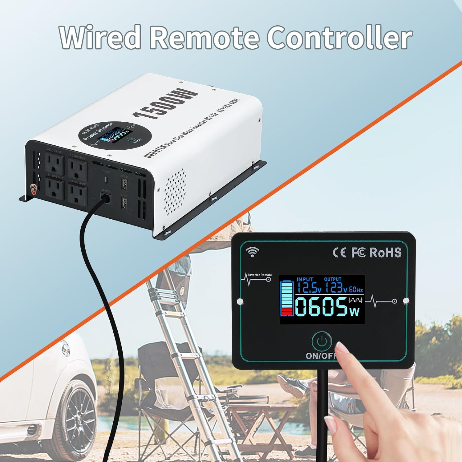 - Upgraded Remote Control: Experience the convenience of advances control with the 1500W inverters upgraded remote controller. This remote supports wireless operation, ensuring you can manage your inverter’s remotely and monitor from remote LCD display.