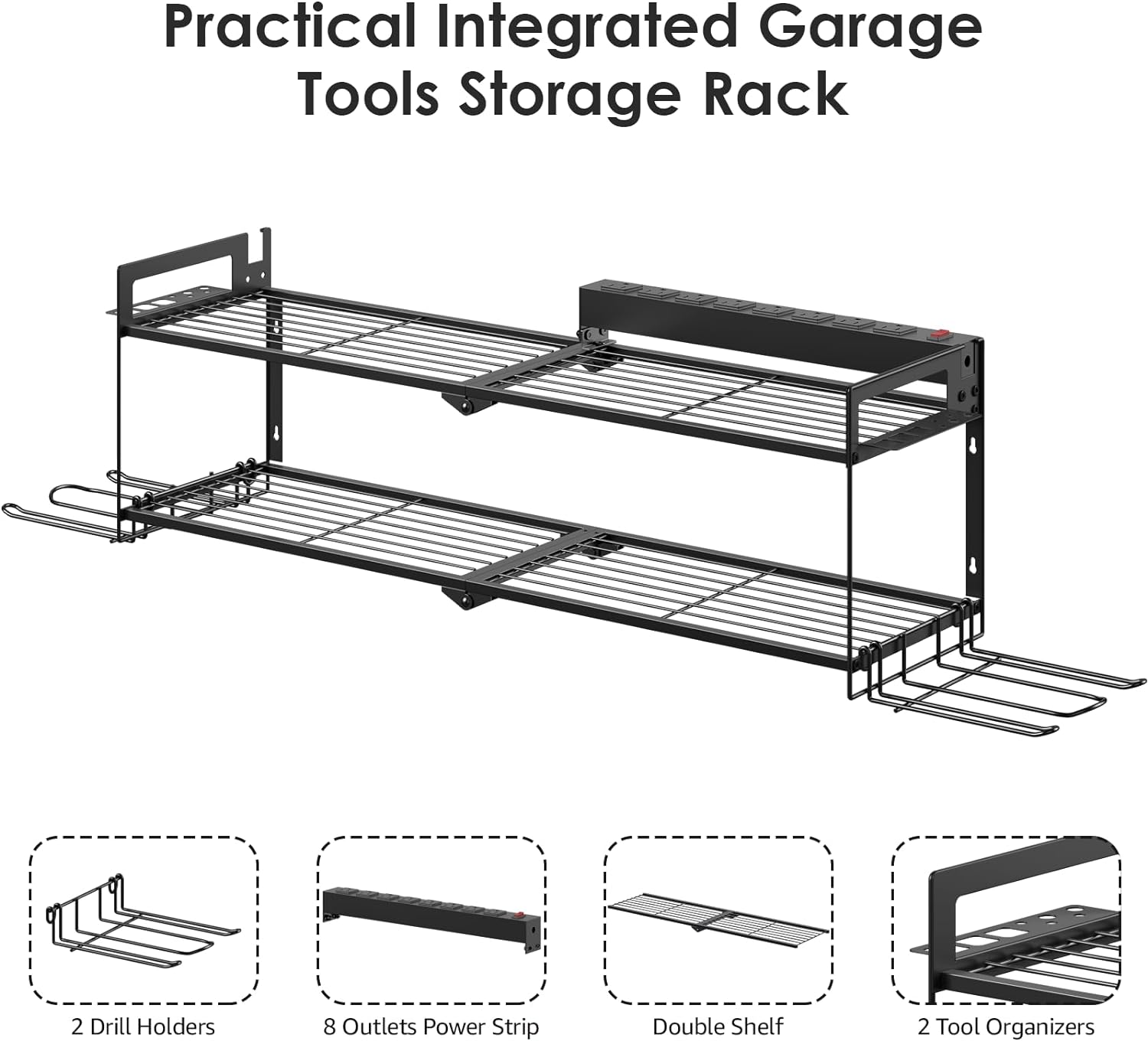 - It will be pretty useful improvement for your garage and includes double shelves, 4 drill holder, power strip, 16 storage holes designed for different size tools. Offers black, red, and yellow as options to match your own tools.