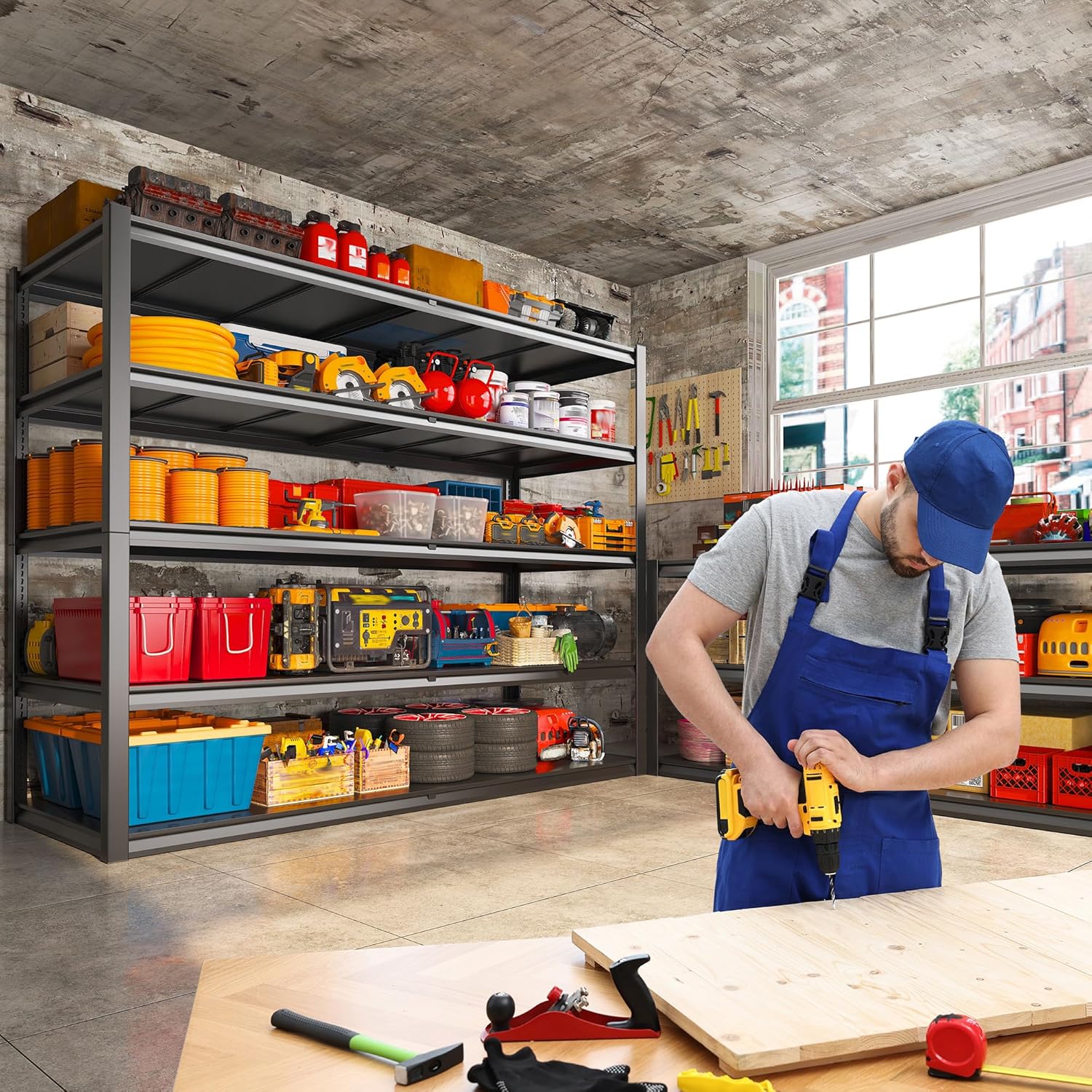 - 【3000LBS Heavy Duty Shelving】These storage shelves heavy duty are built for demanding garage storage. Each sturdy tier holds 27-gallon totes (up to 10 per shelf) with a 600 lbs capacity per level. Constructed from high-quality steel and double-layer thickened racks, the entire shelving unit features reinforced diagonal support beams. Combined with its heavy-duty steel frame, the shelving system delivers a total load capacity of 3,000 lbs
