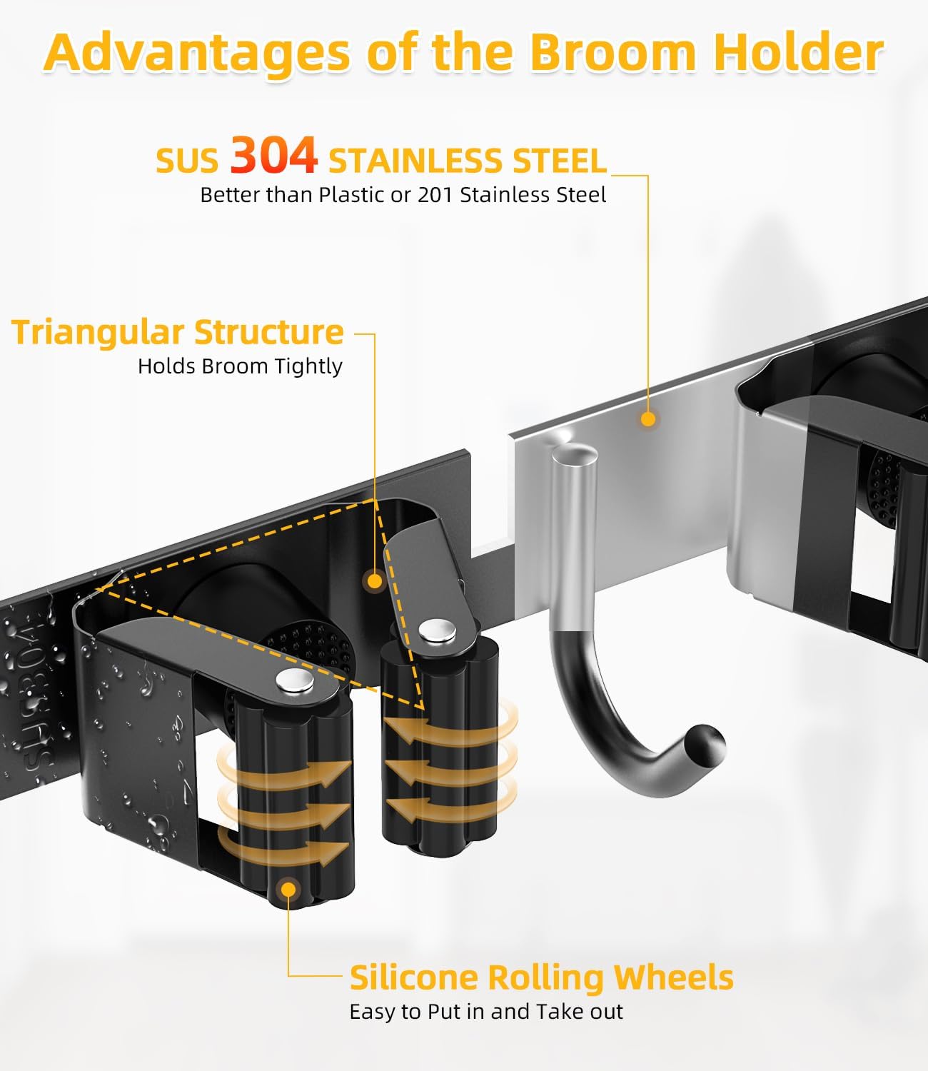 - 304 STAINLESS STEEL , ANTI-RUST & STURDY: The mop and broom holder wall mount is made of 304 stainless steel, making it corrosion-resistant, moisture-proof, and waterproof. Compared with plastic broom racks, it is stronger and more premium quality. This garage organization can hold up to 30 pounds when installed with screws, and the hook can also support your steam mop.