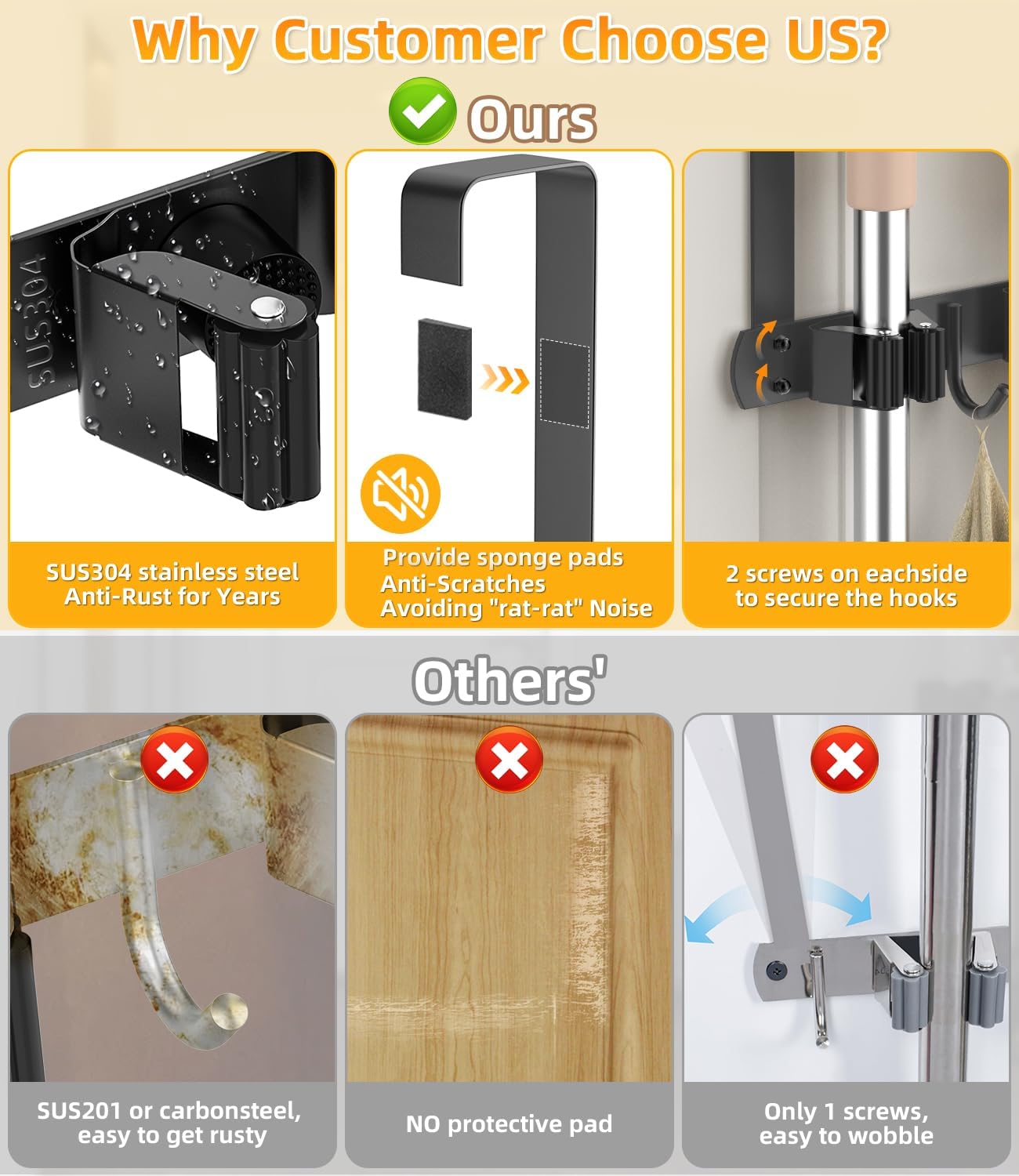 - [Patent] HIDE YOUR TOOLS BEHIND THE DOOR: This specially designed Over-the-Door Broom Holder comes with two over-door hooks, eliminating the need for drilling. This drill-free design allows you to utilize the space behind the door, making it a versatile and damage-free solution. Maximize efficiency and eliminate floor clutter by organizing brooms, mops, and other cleaning tools. (This metal broom holder also comes with Anti-Scratch self-adhesive SPONGE PADS to reduce Rat-Rat noice and protect your door.)