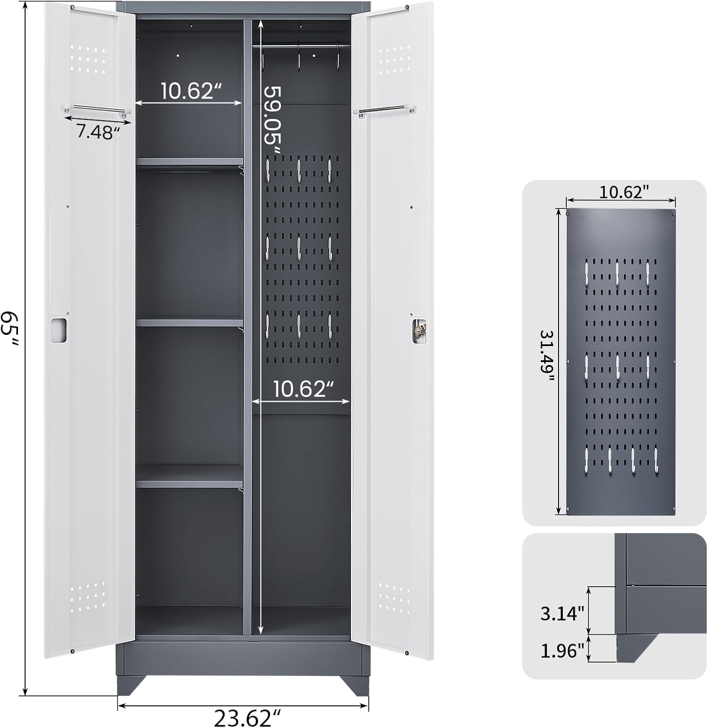 - 【Broom Closet】Dimensions: 15.75"D x 23.62"W x 65"H. This metal garage storage cabinet is made of pure steel material with a powder-coated surface, which is waterproof and easy to clean, ensuring long-term use. The perforated panel design prevents moisture and allows for breathability.