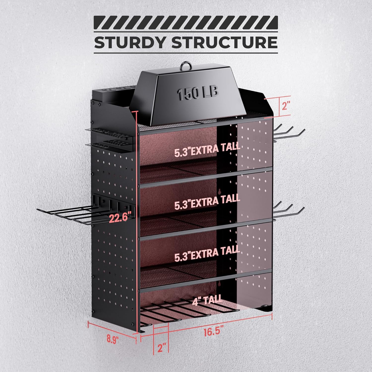 - 5-Layer Efficient Storage: First layer for rechargeable tool organization, middle three layers provide space for garage tools, bottom layer for 4 cordless drills, side pegboards include drill bit rack, 4 long hooks, and drill rack for 2 drills