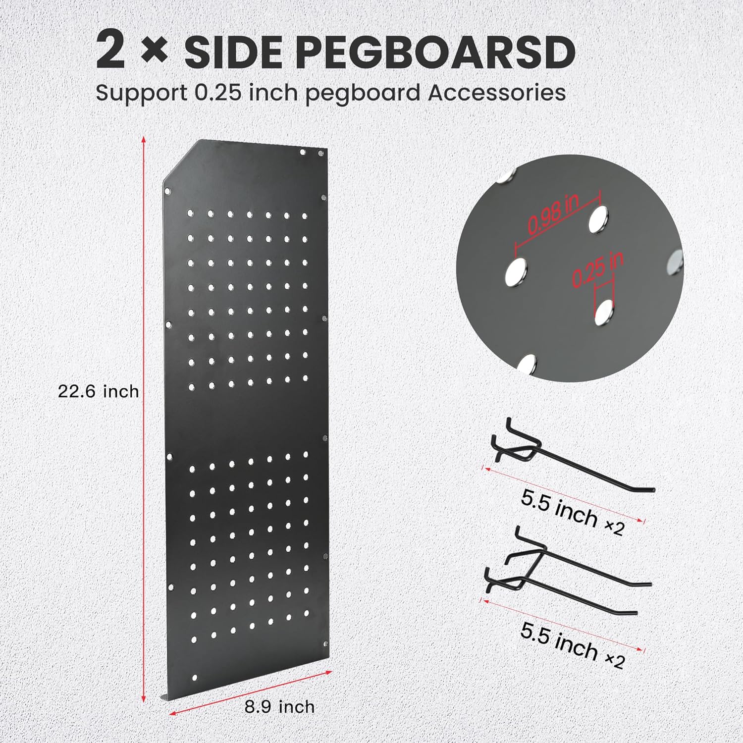 - Versatile Side Pegboards: Hang garage tools on 8.9"W Γ 12"L side pegboards with included long hooks, drill bit rack, and cordless rack, supports 0.25" pegboard organizer accessories for DIY customization