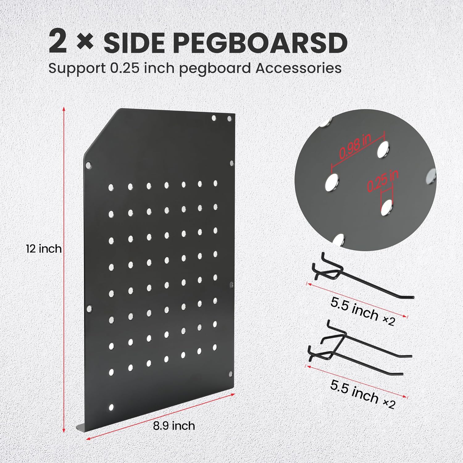 - Versatile Side Pegboards: Hang garage tools on 8.9"W Γ 12"L side pegboards with included long hooks, drill bit rack, and cordless rack, supports 0.25" pegboard organizer accessories for DIY customization