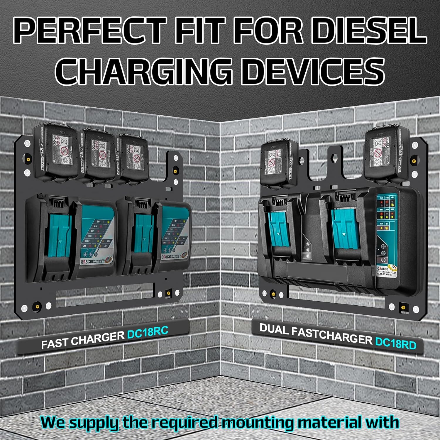 - Multi-Purpose Storage Solution The FETESNICE wall mount for Makita battery charger holder is designed to organize your tool area efficiently. It can hold 2 Makita DC18RC chargers, 1 Makita DC18RD charger, and 4 Makita 18V/14.5V batteries simultaneously. Made from high-quality iron with a smooth oxidized surface, this wall mount shelf for Makita battery is rust-resistant and built to last. Its load-bearing capacity far exceeds traditional wall brackets, ensuring durability and reliability.