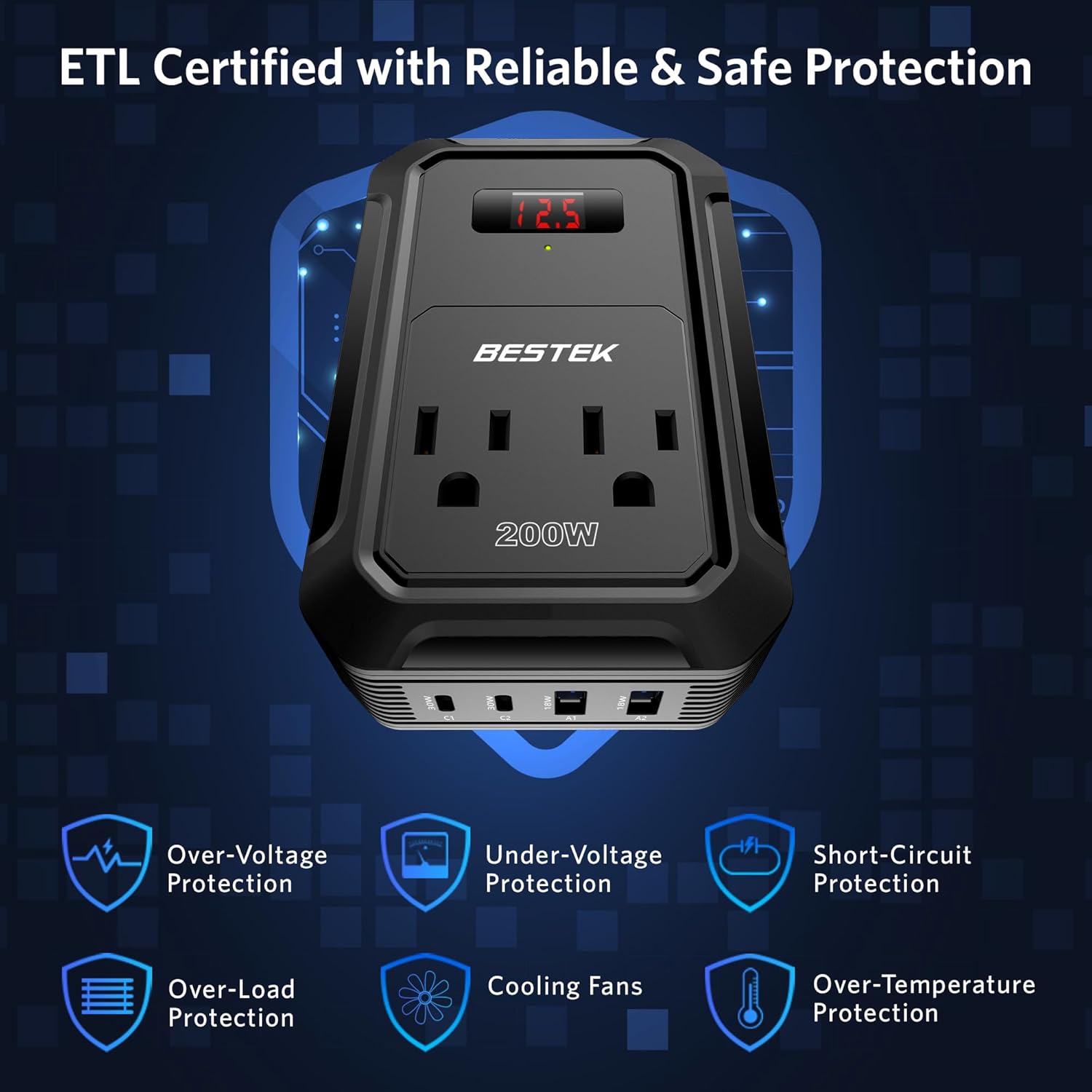 - BESTEK Advantage: America's leading power inverter brand. Provides 200 Watts continuous DC 12v to AC 110v power inverter featuring 2xPD 30W&2xQC 18W USB ports, 2 AC outlets, and a 23.8-inch cable with cigarette lighter plug and LCD Display for you, more convenient.