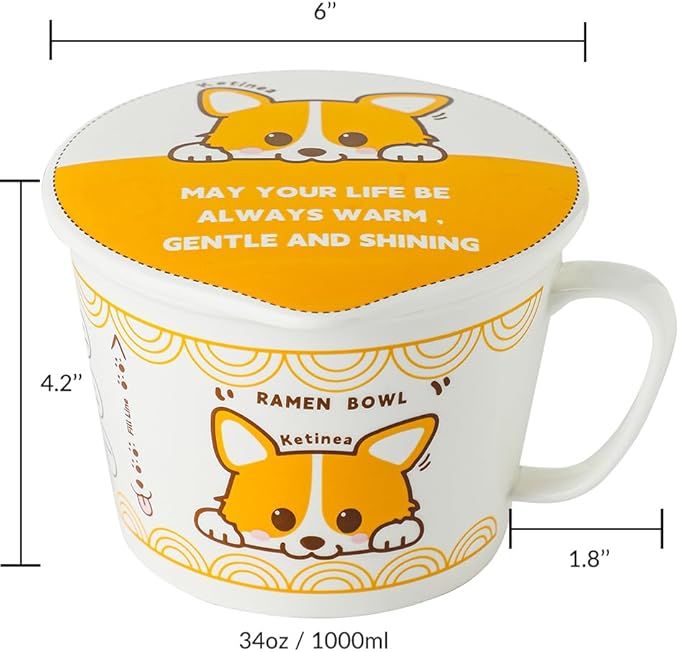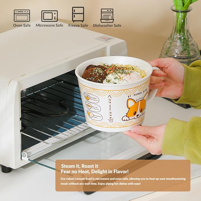 34oz Ceramic Ramen Bowl Set Charming, Lid, Handle, and Stainless Steel Chopsticks Elevate Your Noodle Experience Ideal Gift for Teens and Kids (corgi)