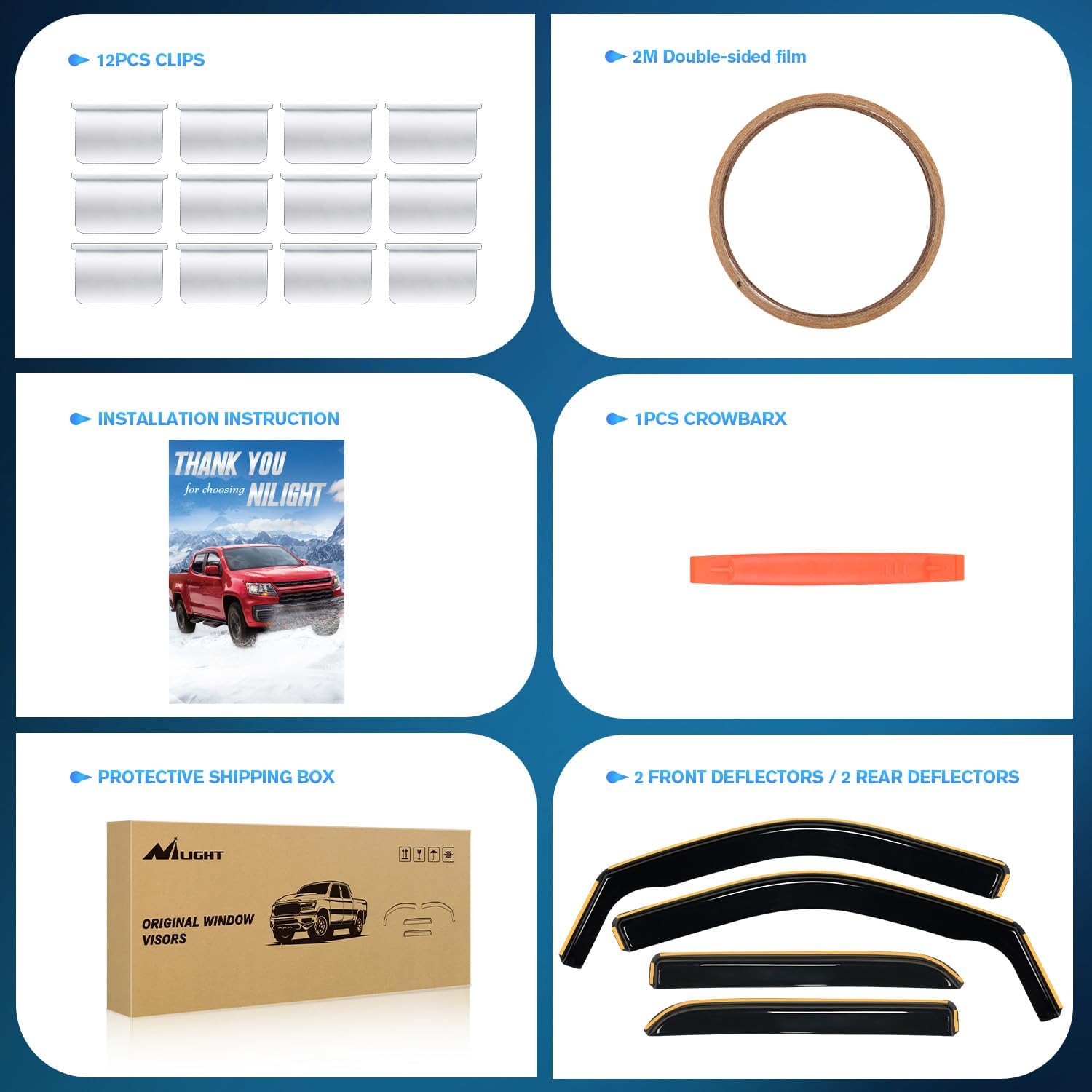 - QUICK AND EASY INSTALL: Nilight Wind Deflectors provides perfect fit for your Car. Just slip it onto your carβs window and your job is done within minutes. There is no drilling or no tools required. Be sure that window deflectors are water resistant, sun protective and will not bend, break or crack regardless of the weather conditions
