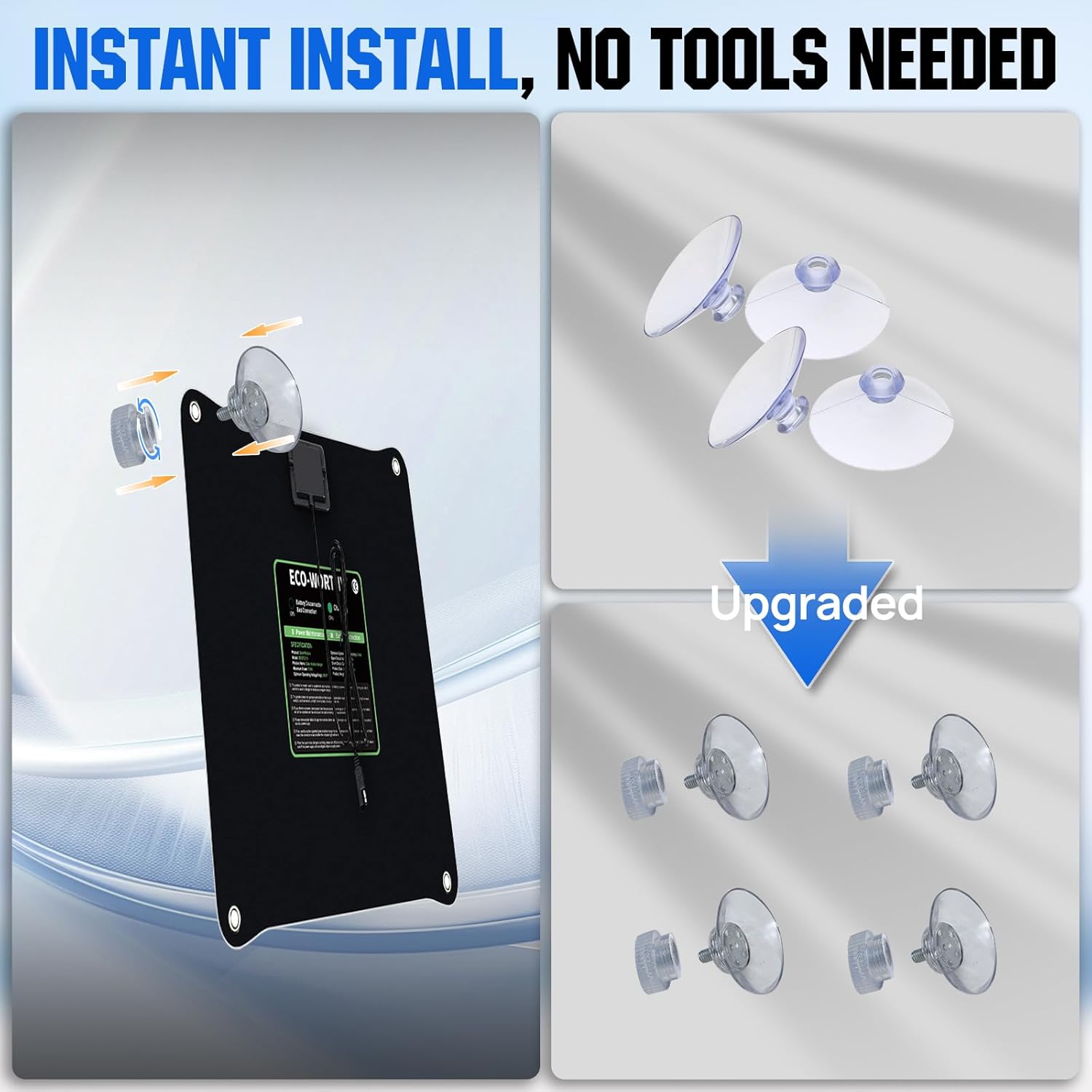 - [Easy to Install and Use]The Outdoor Solar Battery Maintainer is simple to install and easy to use, just directly connect the solar panel to the battery with alligator clips. The solar panel is bendable to fit windscreens and has a strong hold on the 4 PVC suction cups it is equipped with. Also, it's easy to carry outdoor and restore on your car. Dimension: 9.84*8.66*0.47in, 0.05lb
