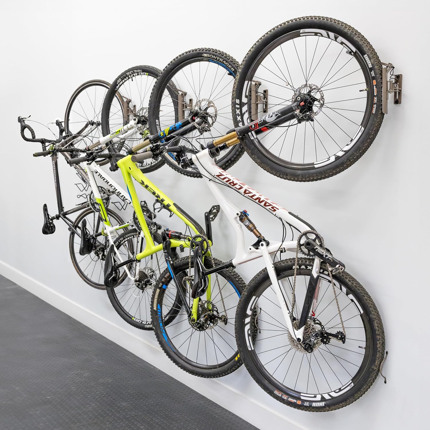 • WALL-MOUNTED BIKE STORAGE – Reclaim your garage, shed, or apartment space with this space-saving vertical bike rack. Designed to mount securely to wall studs, each rack stores one bicycle flat against the wall, making it ideal for indoor bike storage in tight spaces. Compatible with a variety of bikes including road bikes, e-bikes, folding bikes, and more. Fits tires up to 2.6" wide and up to 29" in diameter.