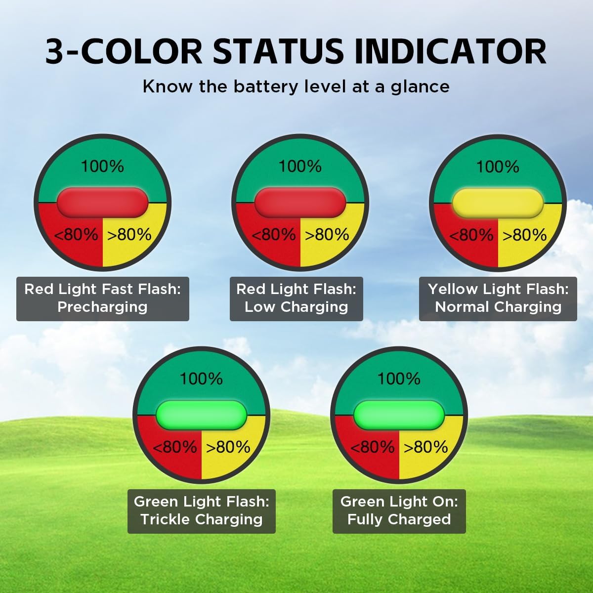 - 【3-Color Status Indicator】The club car 48v battery charger has a 3-color indicator light that help you to know the battery level at a glance. 1) Red Light Fast Flash: Precharging(<20%); 2) Red Light Flash: Constant current charging (20%~80%); 3) Yellow Light Flash: Constant-voltage limitary-current charging (>80%); 4) Green Light Flash: Trickle charging(≈100%); 5) Green Light is Always On: Fully charged (100%).