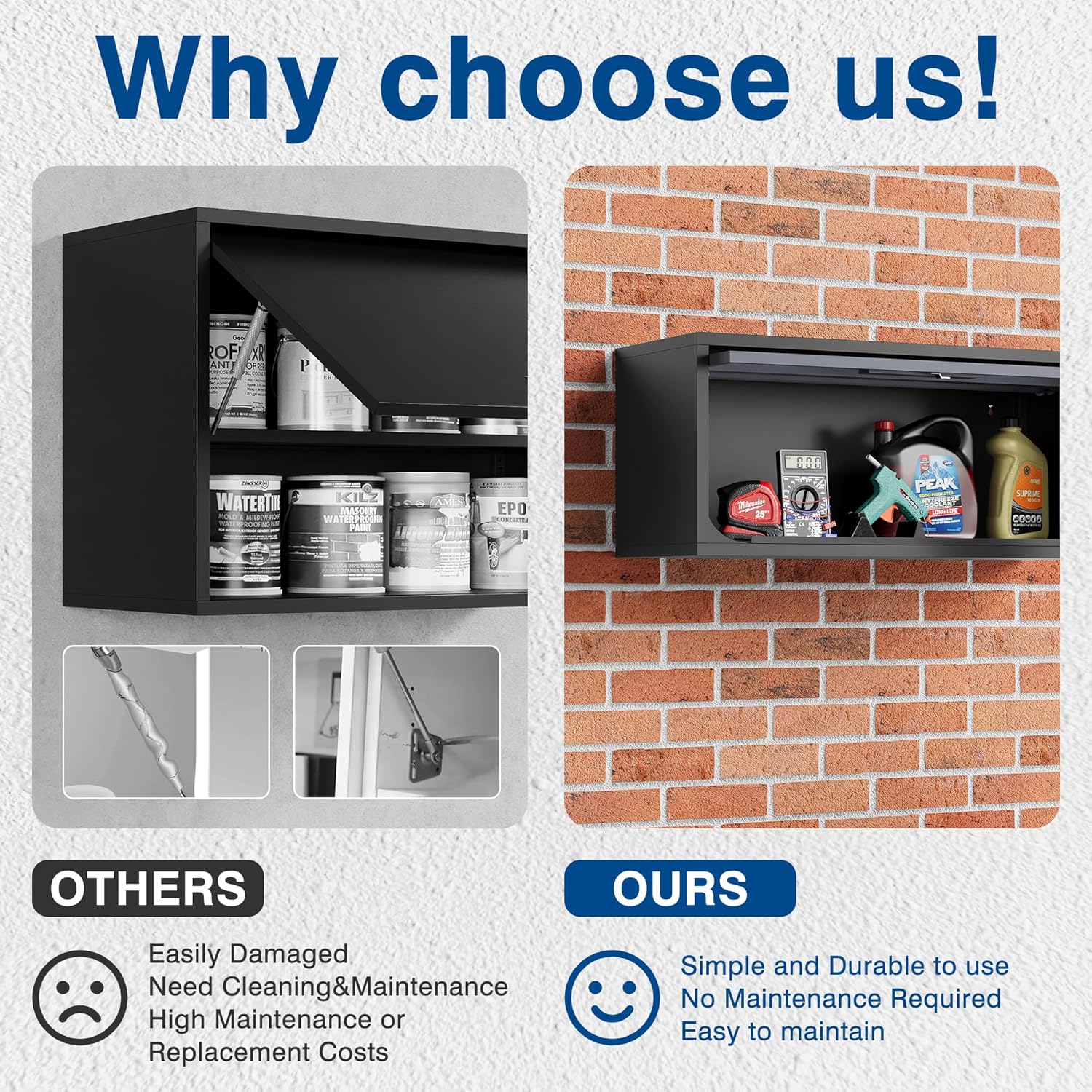 - Revolutionary Upgraded Opening and Closing System: Traditional left-right opening methods carry a risk of bumping heads. Our storage cabinets feature a unique top-bottom opening mechanism, where the entire door can be recessed into the cabinet itself, making full use of upper space and facilitating easy access to items stored inside.