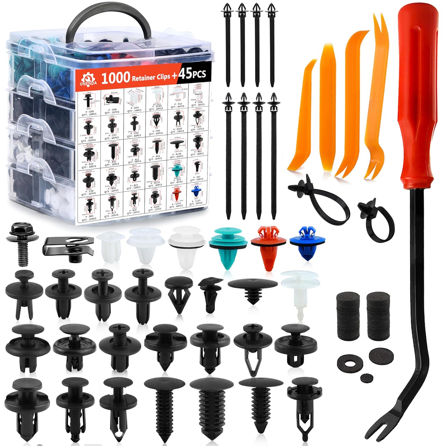 - UNIVERSAL AUTOMOTIVE CLIPS KIT: 1045 PCS great assortment push retainer kit including 30 most popular sizes, 4 different kinds tools with 1 Red Fastener Remover, fitting for door trim, radiator shield yoke, fender, bumper, side skirt, grille, engine cover and splash shield retainers replacement,compatible with Ford, GM, Chrysler, Toyota, Honda and more
