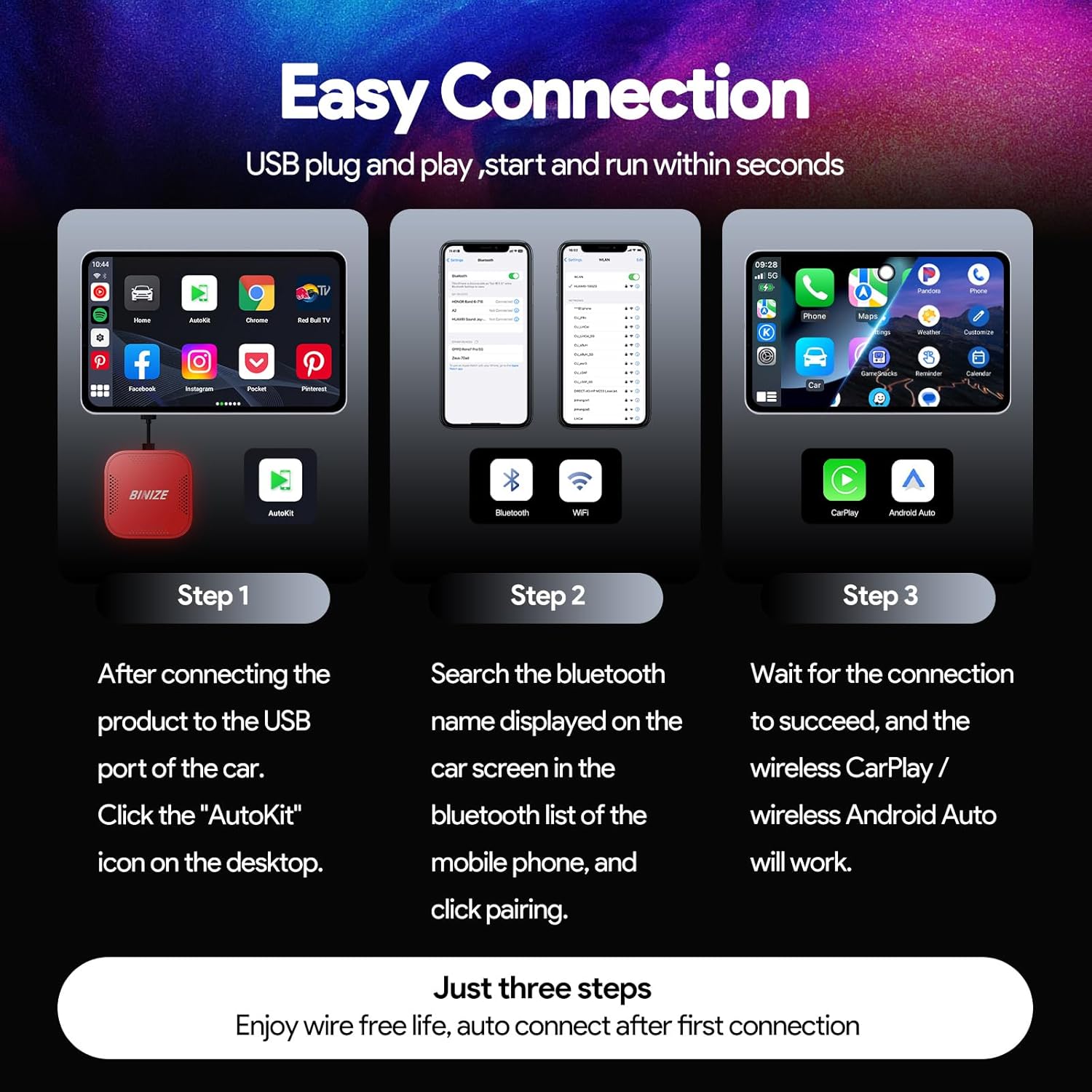 - For Cars with OEM Wired CarPlay: The Binize CarPlay AI Box is designed to enhance the capabilities of your car's existing infotainment system by providing wireless connectivity. With its seamless integration and easy installation, this Carplay ai box allows you to enjoy hands-free calling, messaging, music streaming, and more. Carplay AI Box Streaming Device is designed specifically for cars that have OEM Wired CarPlay. Plug-and-play installation process that takes just a few minutes.