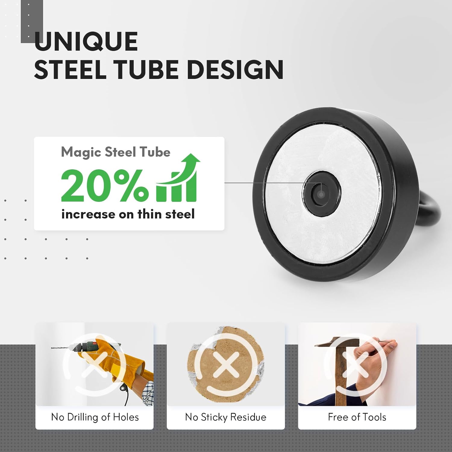 - ✔MAGIC STEEL TUBE DESIGN - Unique design of steel tube inside the base of magnetic hooks greatly increases the attractive force , especially on thin steel! It increase approximately 20% force comparing those none-tube magnets. it solves the problem of weak force on thin steel. Permanent magnetic hook with magic steel tube, strong magnetism lasts forever!
