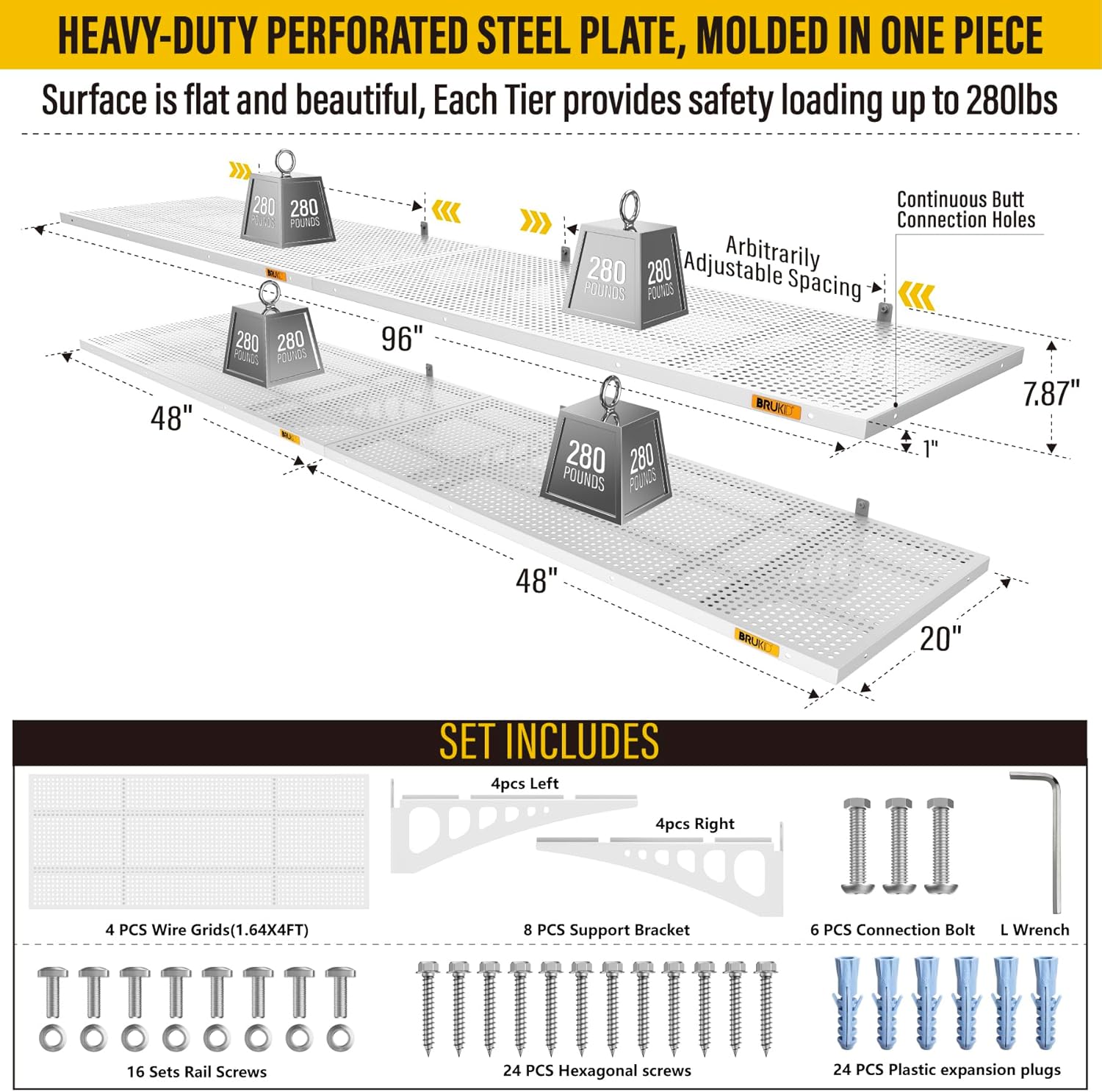 - SUPERIOR DESIGN: Wall shelf garage storage rack panel is made of whole piece of perforated steel plate bending and welding, the surface of matte high temperature powder baking paint, flat and smooth; the panel adopts slide rail design, can be adjusted by parallel left and right sliding at will; bracket can be freely installed in 45β range of the spacing of the wood wall keel, without affecting the precision connection with the panel, eliminating the worry of being unable to docking due to the mismatch of spacing points of load-bearing wood wall keel or inaccuracy of the installation of the bracket. It saves time and labor