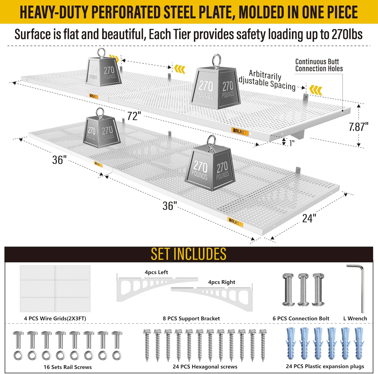 - KIT INCLUDES: Includes 4pcs of face plate; 8 Brackets; 24 Hexagonal screws (Hardened β 0.2" L/2"); 24 plastic expansion plugs, 16 Sets of rail attachment bolts; 1 L-wrench; 1 installation manual. All the hardware of Brukid professional series wall mounted shelves are under strict quality control and testing, we strive to provide our customers with a quality shopping experience, when you receive the product encountered any problems, please contact us at the first time, we will certainly give you a satisfactory solution