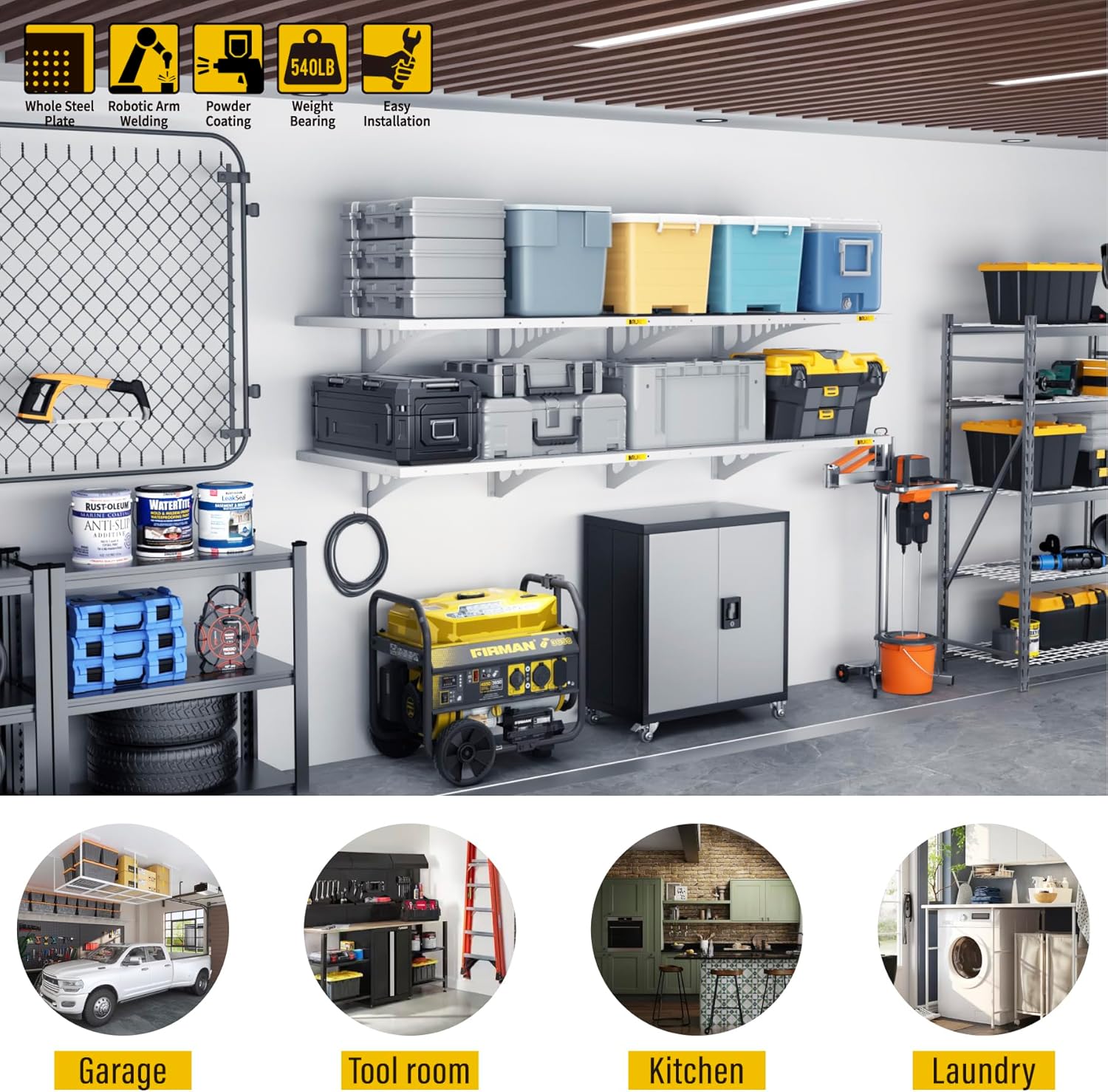 - SUPERIOR DESIGN: Wall shelf garage storage rack panel is made of whole piece of perforated steel plate bending and welding, the surface of matte high temperature powder baking paint, flat and smooth; the panel adopts slide rail design, can be adjusted by parallel left and right sliding at will; bracket can be freely installed in 33β range of the spacing of the wood wall keel, without affecting the precision connection with the panel, eliminating the worry of being unable to docking due to the mismatch of spacing points of load-bearing wood wall keel or inaccuracy of the installation of the bracket. It saves time and labor